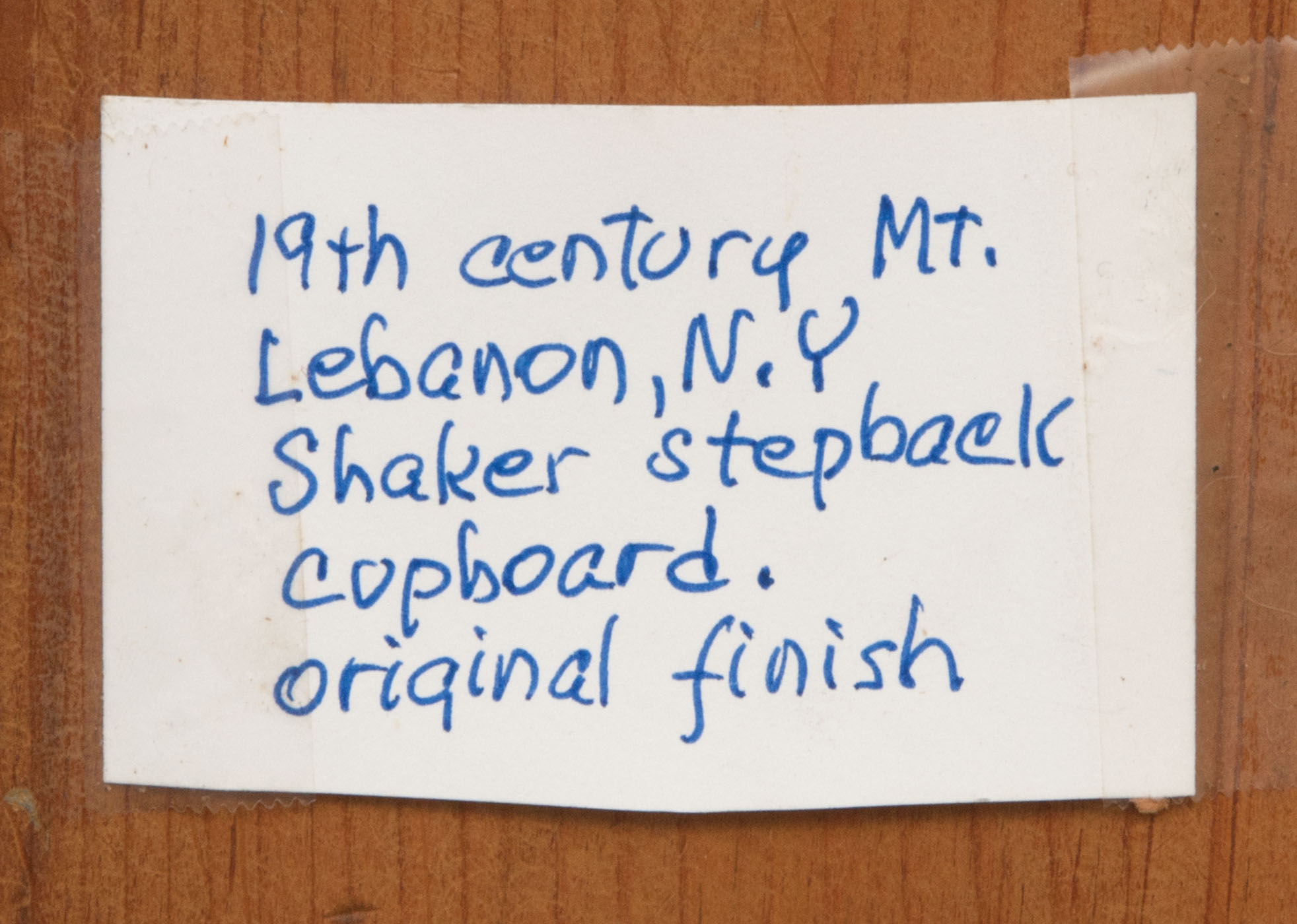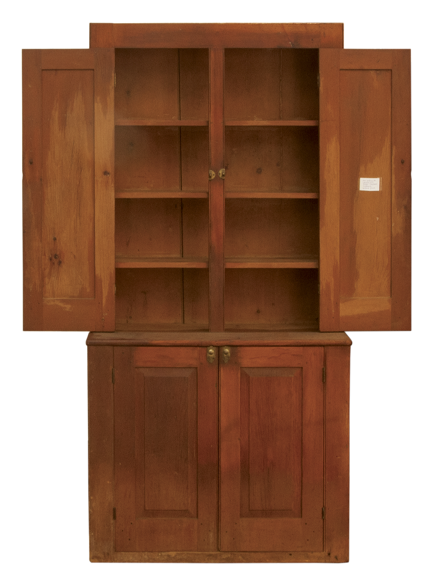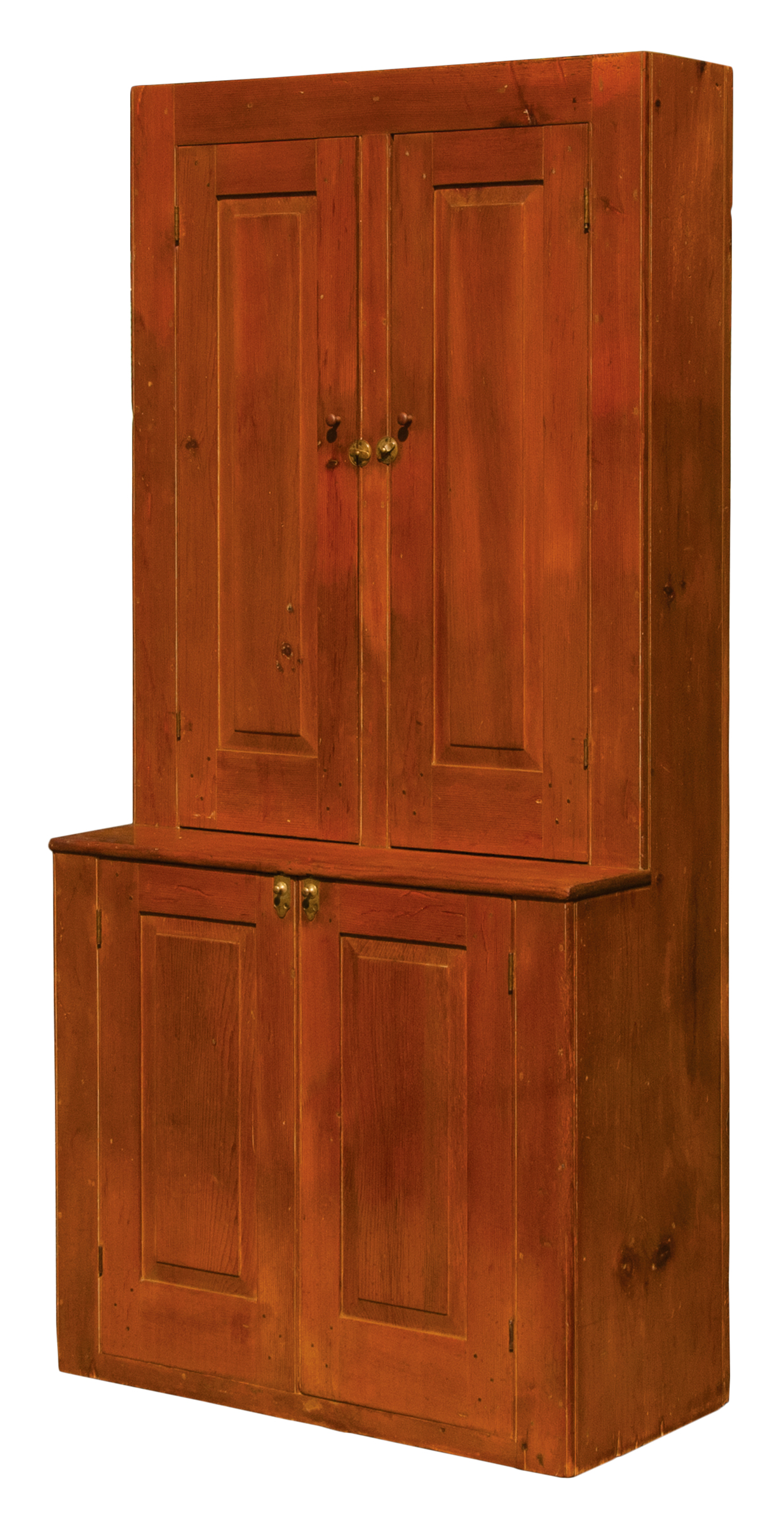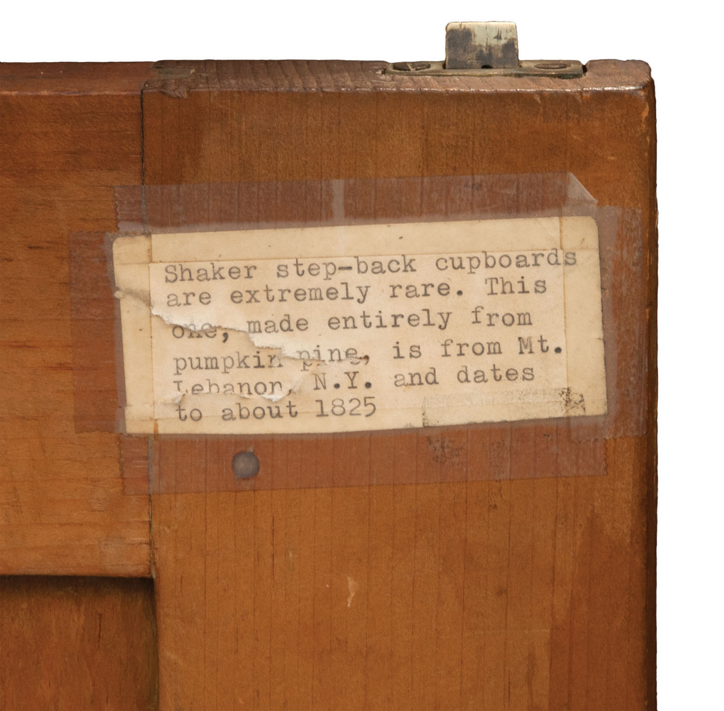 Pine, traces of original brown stained finish, two vertical raised panel doors, with original finely turned cherry wood pulls, through mortise and pin construction, brass door closures, thumbnail molding on corner sides and either side of the doors, three-shelf interior with plate rails, bottom section with similar raised panel doors through mortised and pinned, “Mt. Lebanon N.Y. stepback cupboard c. 1830, purchased from a New Lebanon, N.Y. antique shop in the 1980’s, Ed Clerk Estate Collection.”, 6′ 11″ h, 39 1/2″ w, 8 1/2″ d (top), 18 1/2″ d (base), (ex. Ed Clerk collection).
