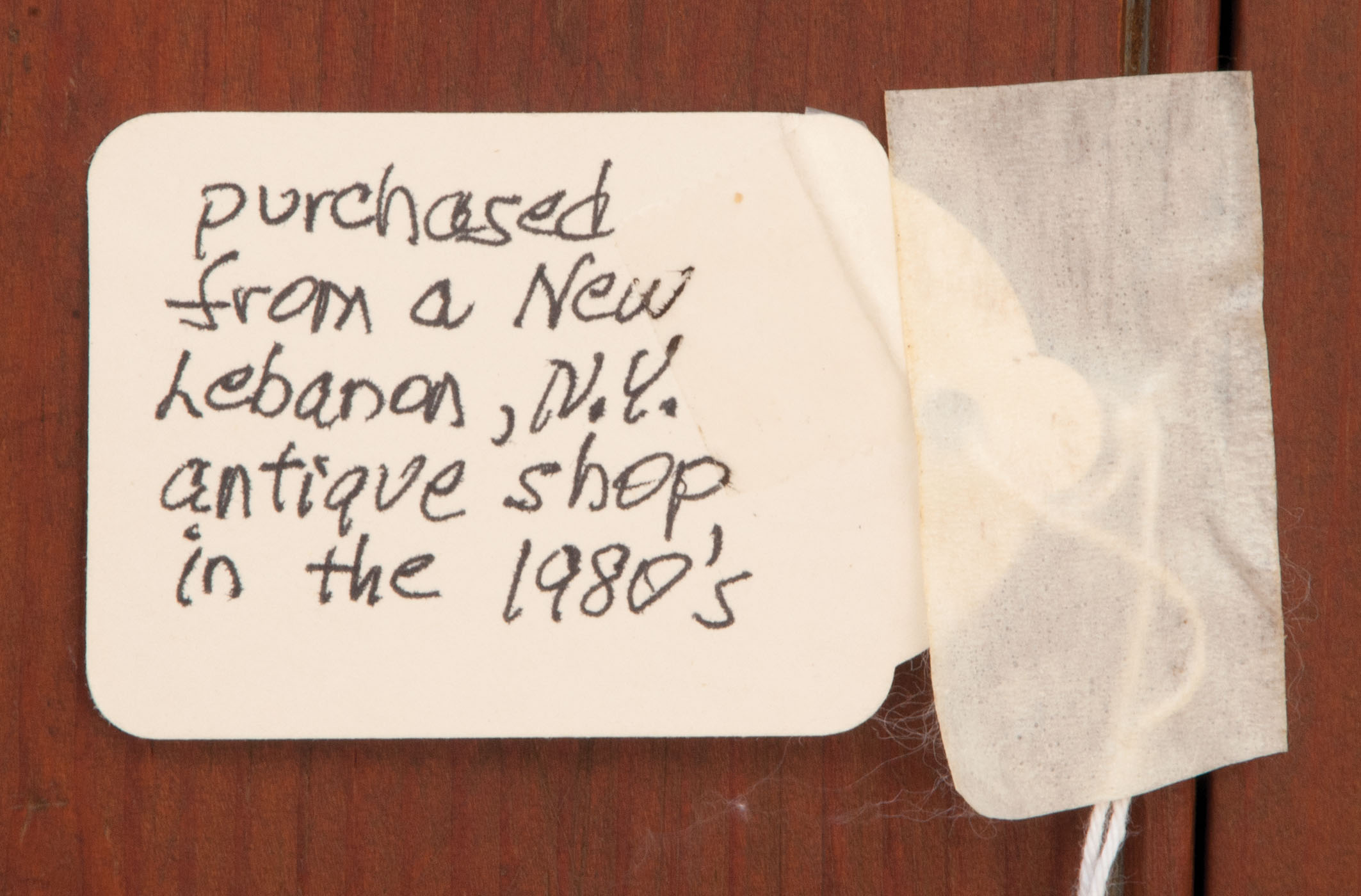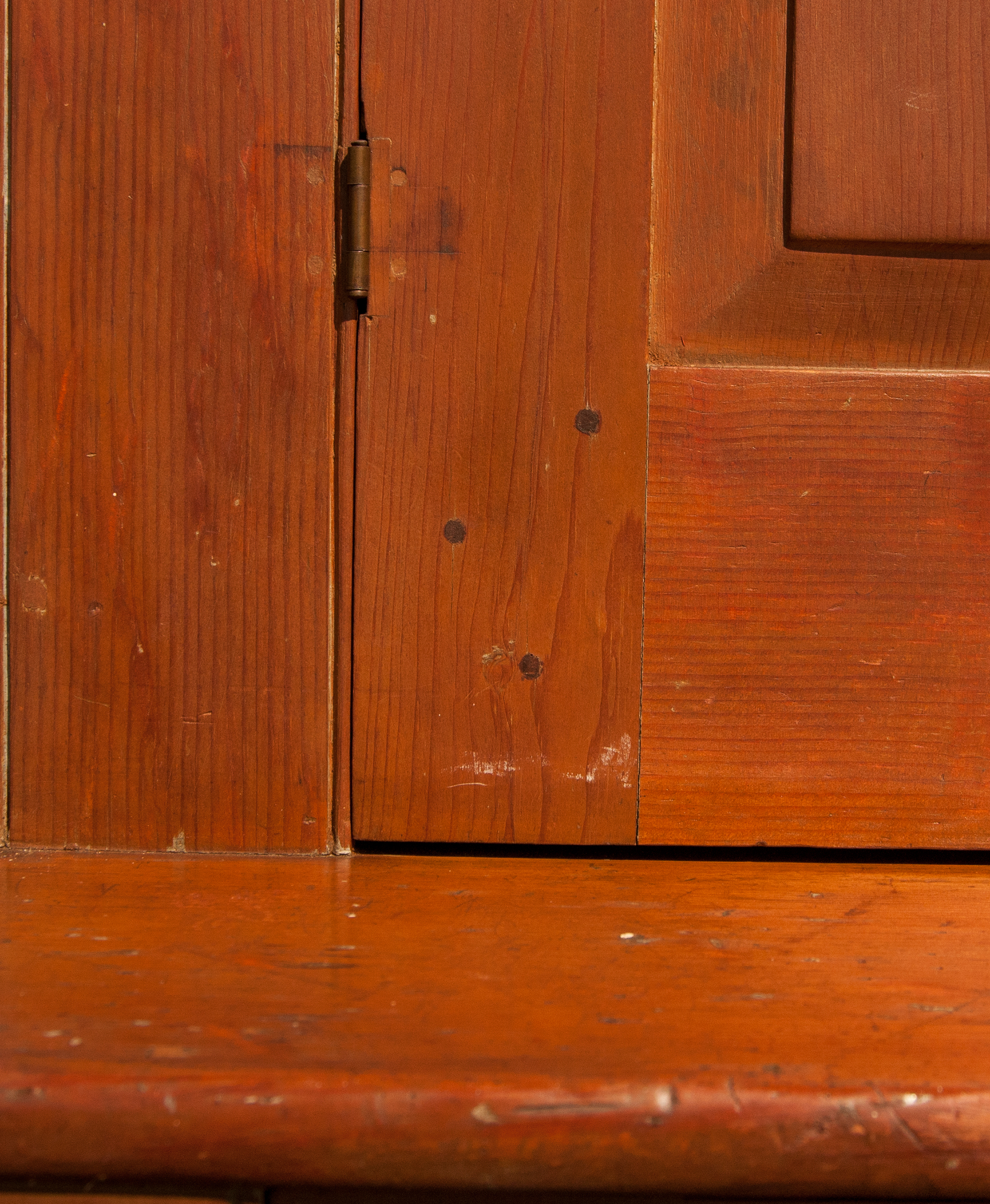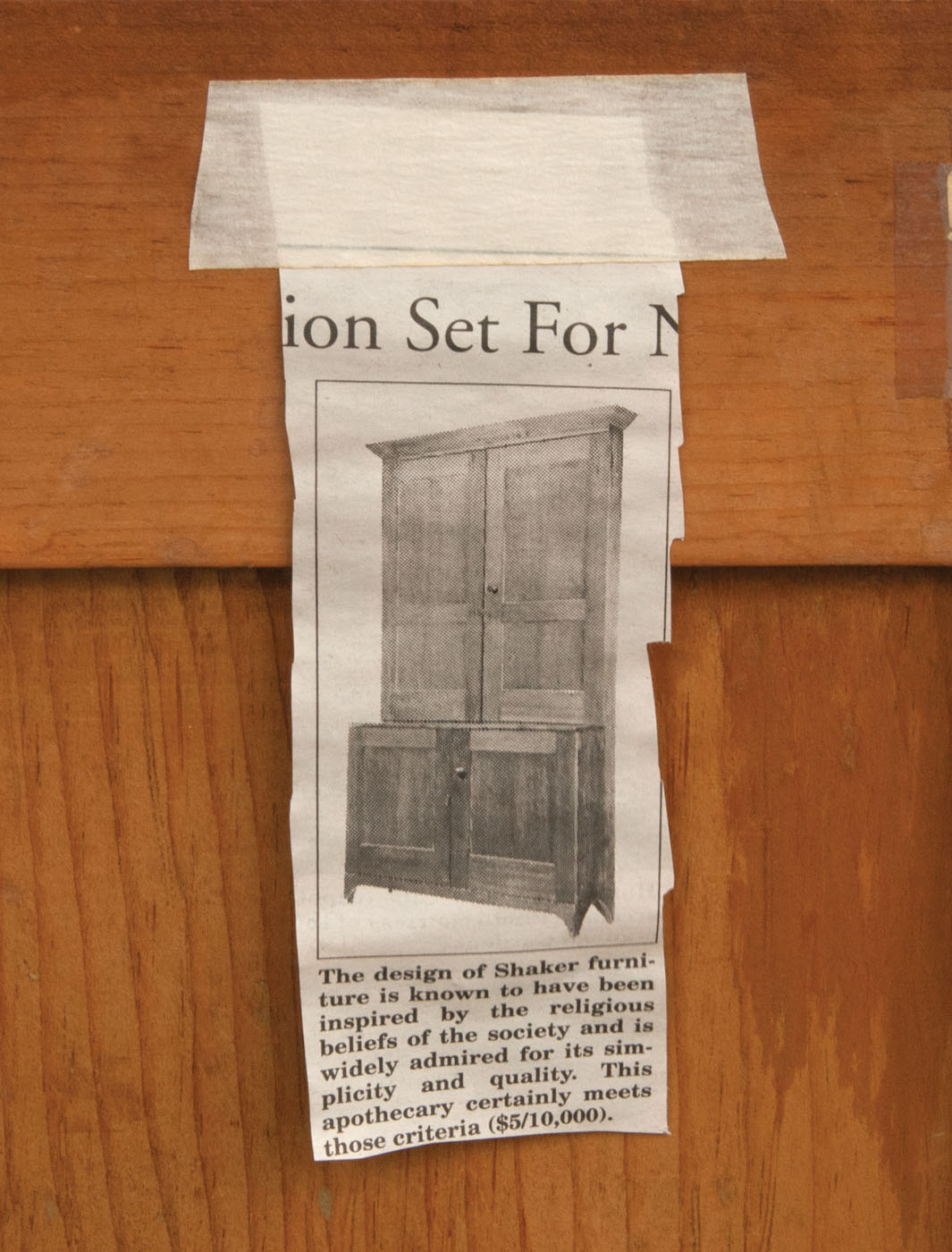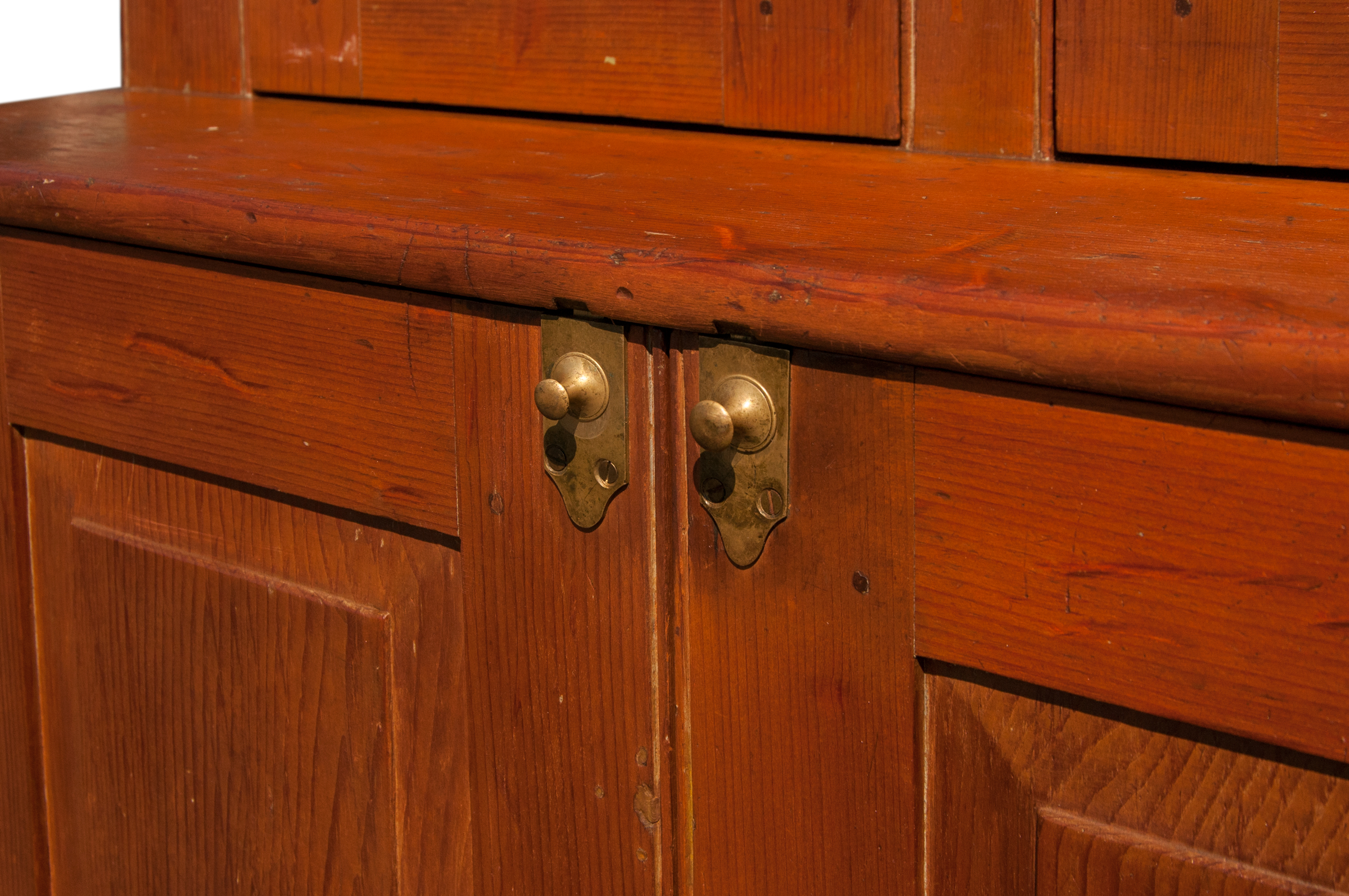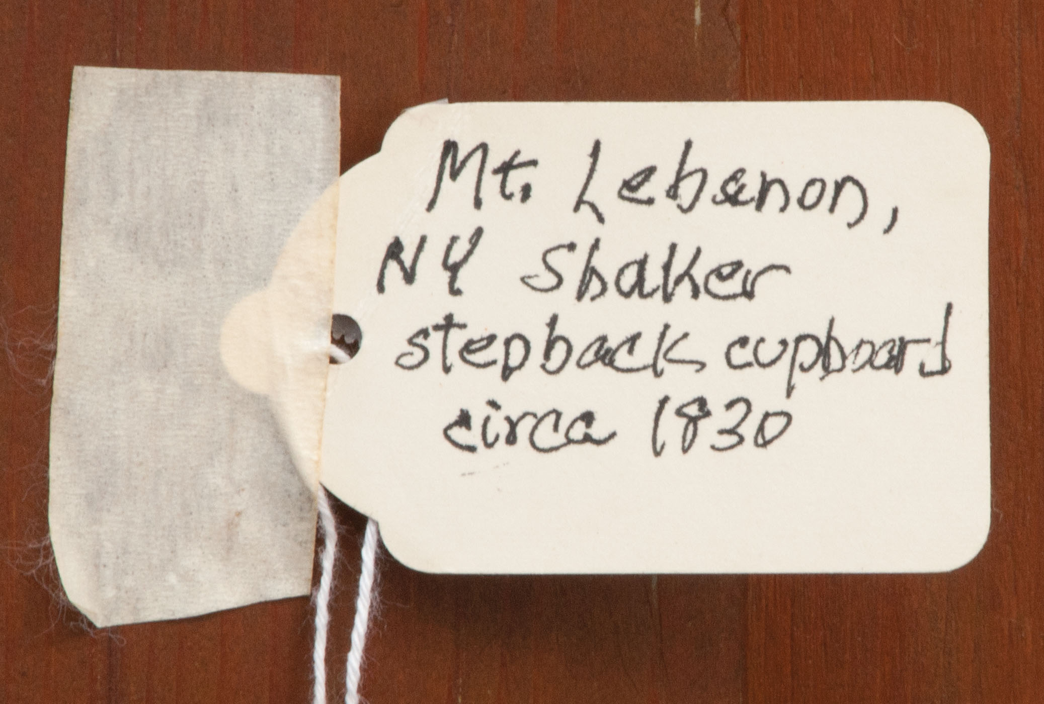 Pine, traces of original brown stained finish, two vertical raised panel doors, with original finely turned cherry wood pulls, through mortise and pin construction, brass door closures, thumbnail molding on corner sides and either side of the doors, three-shelf interior with plate rails, bottom section with similar raised panel doors through mortised and pinned, “Mt. Lebanon N.Y. stepback cupboard c. 1830, purchased from a New Lebanon, N.Y. antique shop in the 1980’s, Ed Clerk Estate Collection.”, 6′ 11″ h, 39 1/2″ w, 8 1/2″ d (top), 18 1/2″ d (base), (ex. Ed Clerk collection).