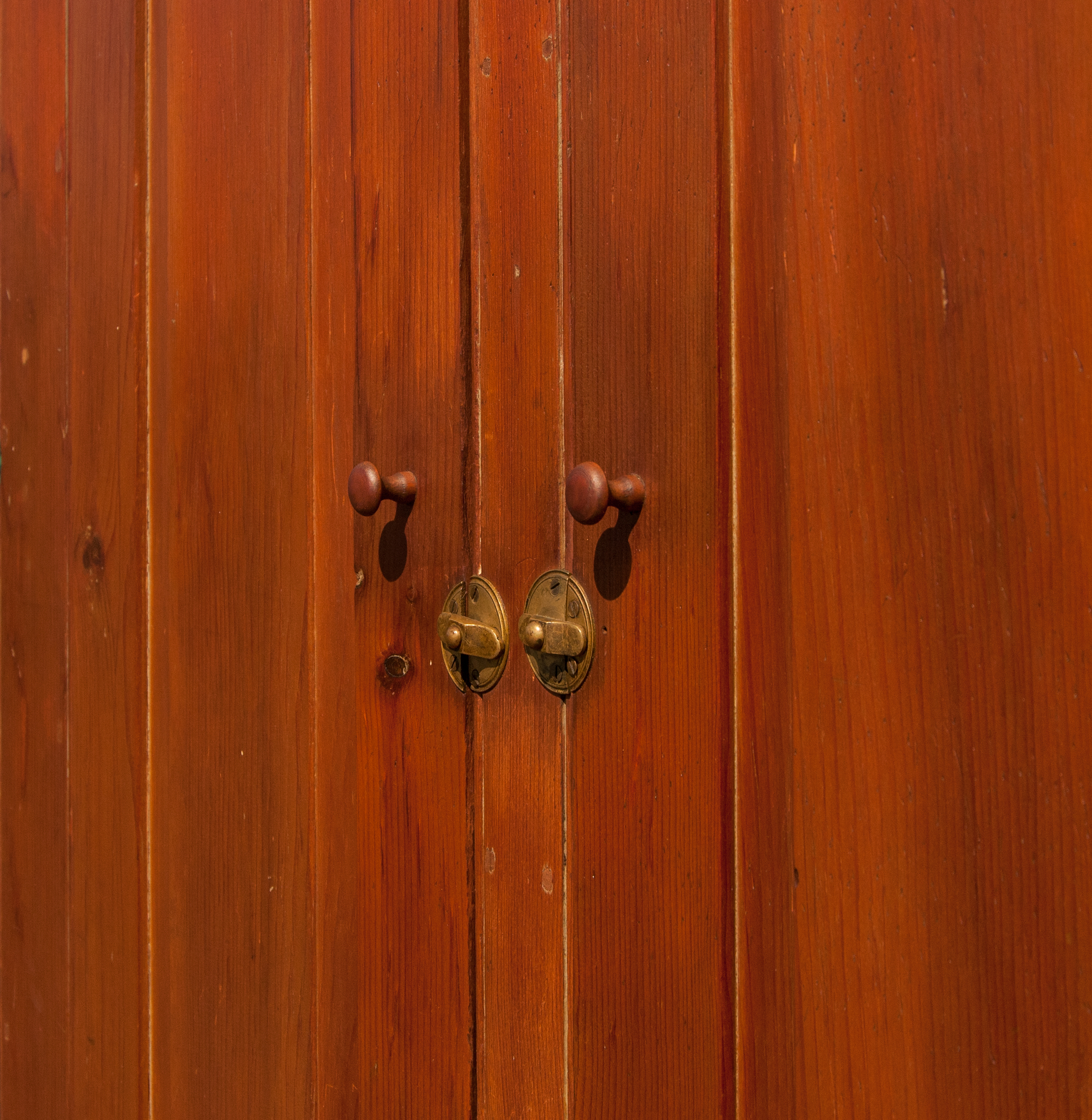 Triple pins at the bottom, brass spring loaded closures with brass pulls.