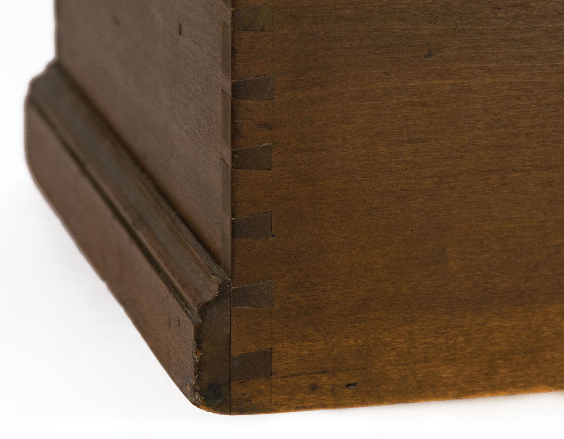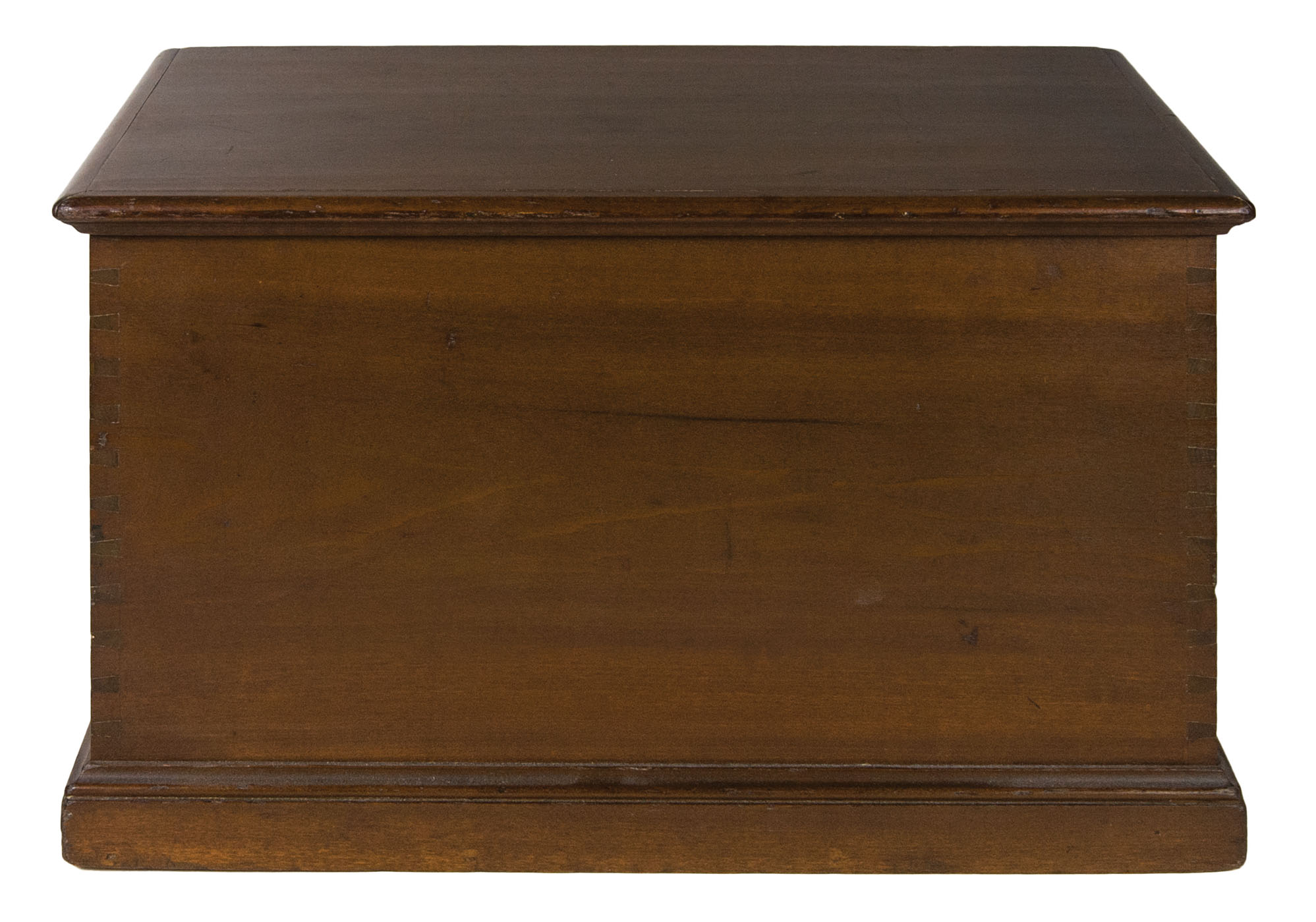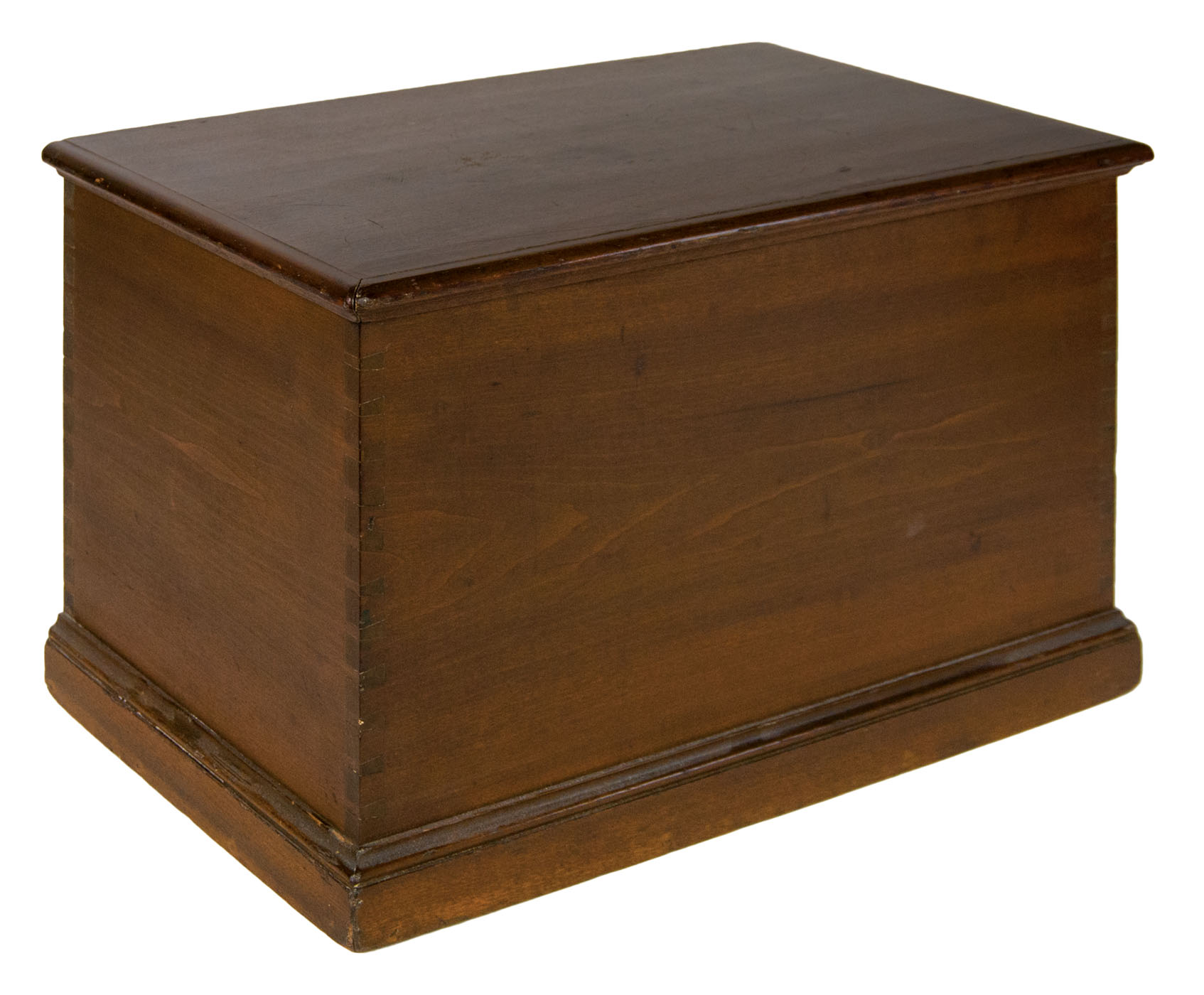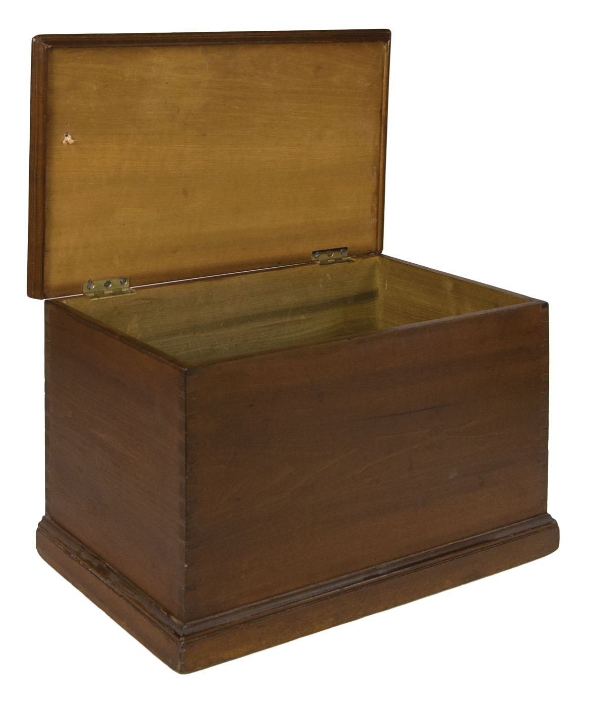 Poplar, original dark walnut stained finish, single board lid with applied moldings, brass hinges, finely dovetailed, applied molding around base, “purchased from the Shakers by Faith And Edward Deming Andrews and given by Faith to Don Emerich for his work on the exhibition and catalog, Shaker: Furniture and Objects from the Faith and Edward Deming Andrews Collections, Renwick Gallery-Smithsonian Institution, 1974″, 10 1/4″ h, 16″ w, 9 1/2″ d, (ex. Don Emerich collection).