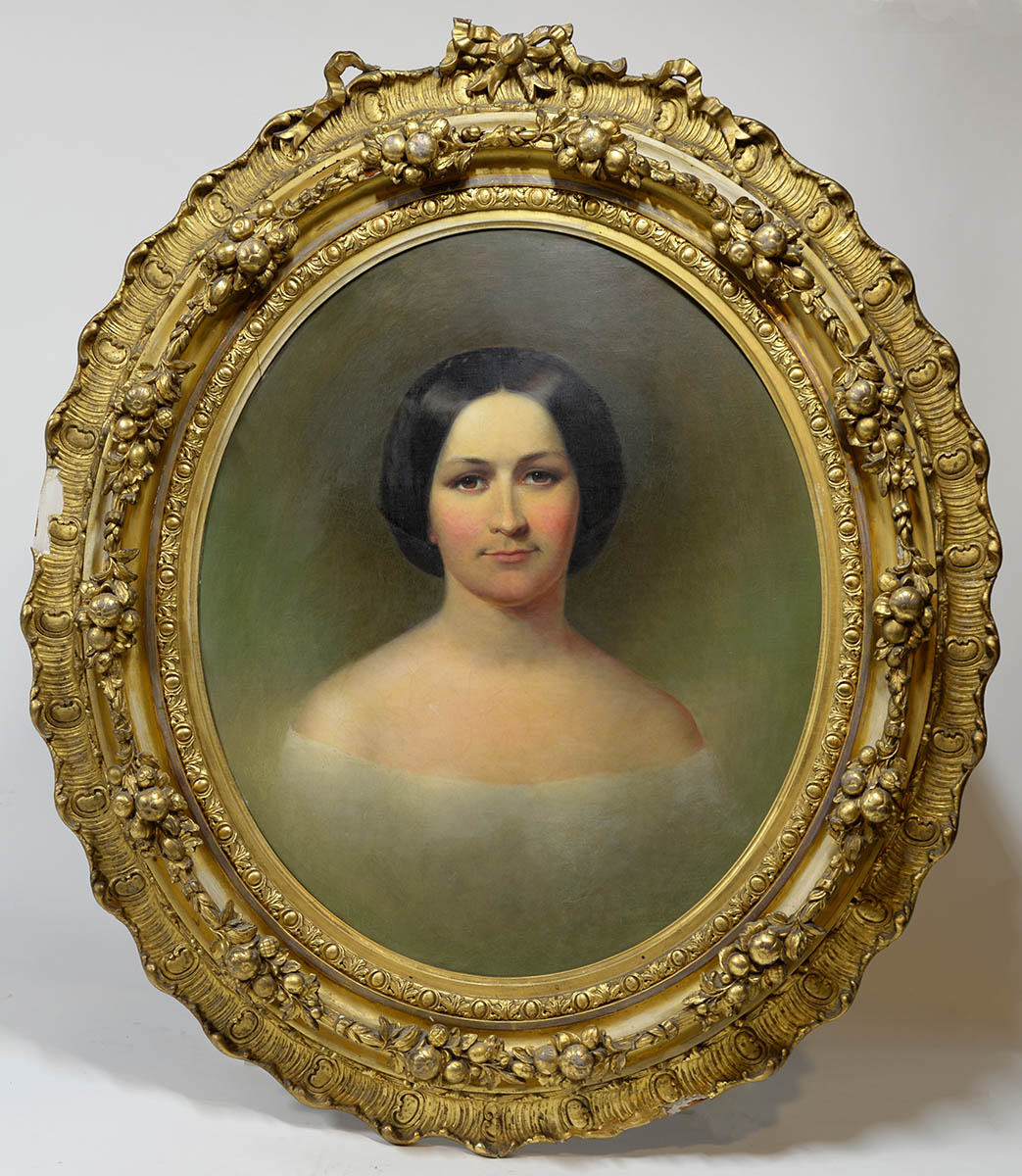 19th c. portrait of a young lady, with dark hair, intricately carved frame, bows and floral motif, (portion of frame needs repair on left side), overall good condition, Belknap collection, 23 1/2″ x 19 1/2″ (sight), 36″ x 31″ (frame).