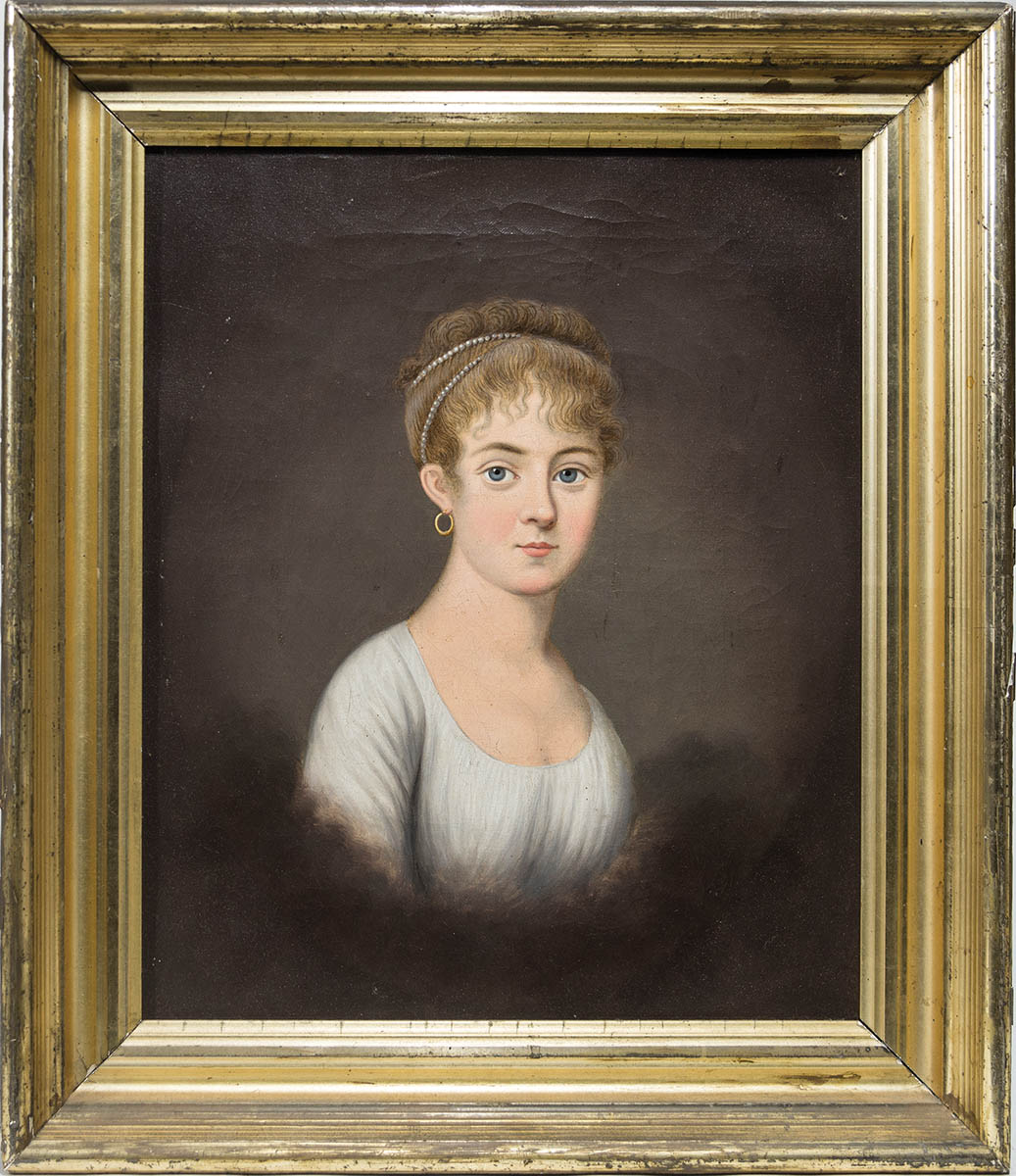 19th c. oil on canvas, portrait of a young girl with strands of pearls in her hair, gold hoop earring, blue eyes, carved, molded and gilt frame, 16″ x 13 1/2″ (sight), 21 1/4″ x 18 1/2″ (frame).