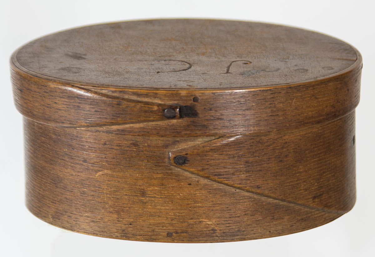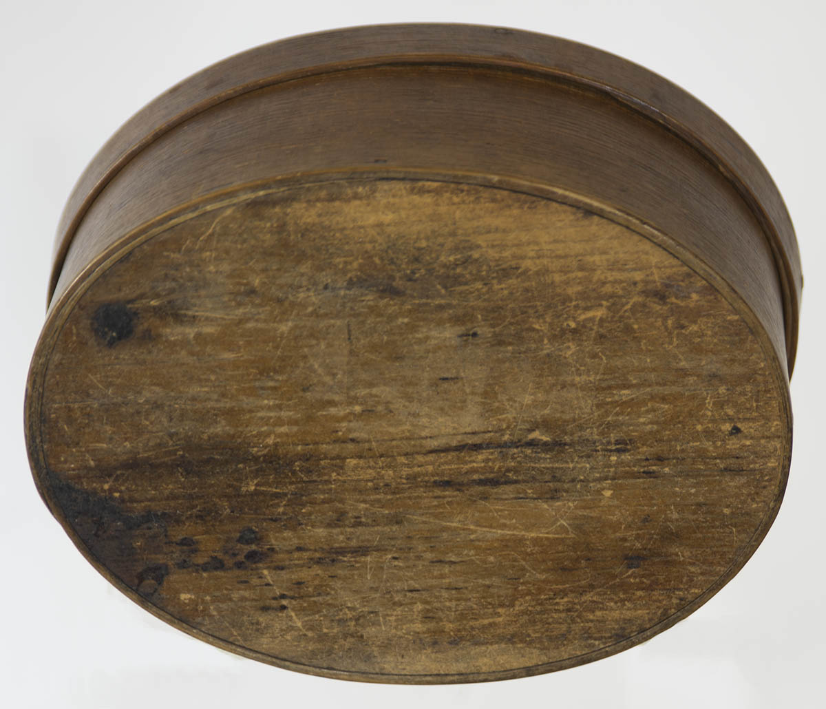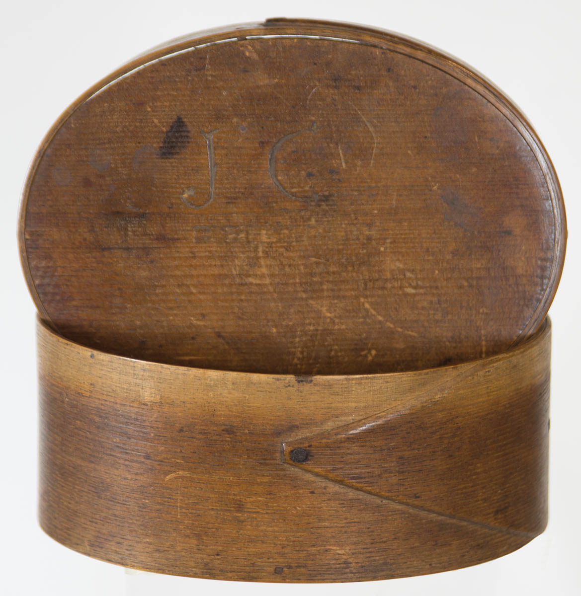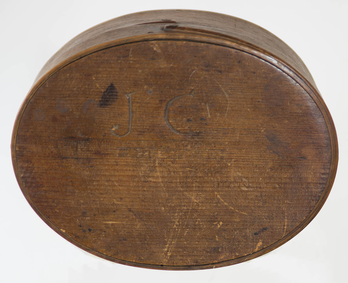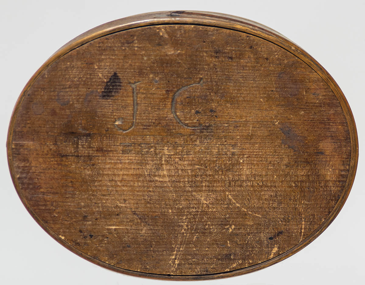 Oval, pine and maple, original patinated finish, faintly stamped on lid “B Sprague”, carved initials “J C”, good condition, 2 7/8″ h, 6 1/2″ l.