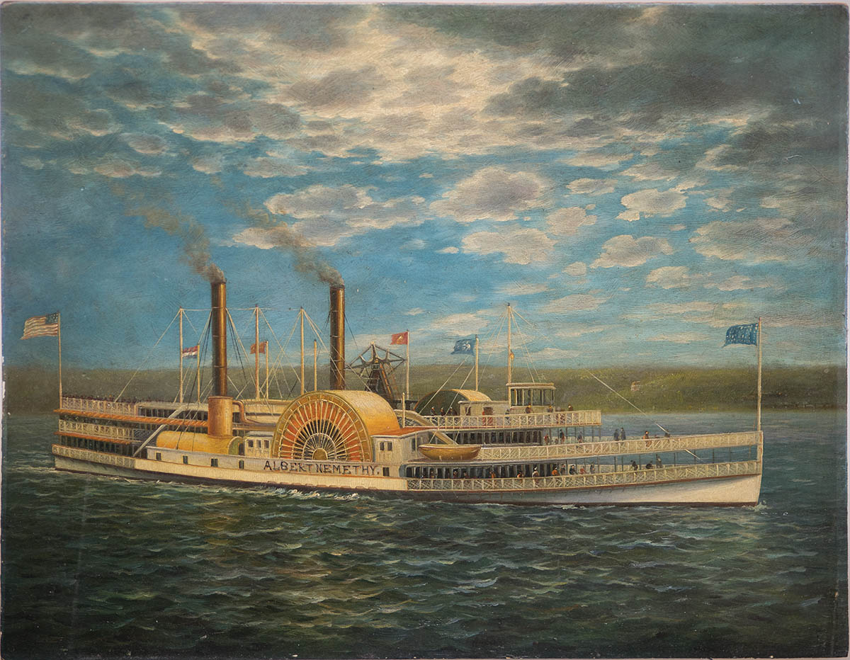 Early oil painting, ship portrait on board, of the “Albert Nemethy” paddlewheel steamboat, six flags (American), shows passengers on three decks, from an Albany, NY collection, 12″ x 15″.