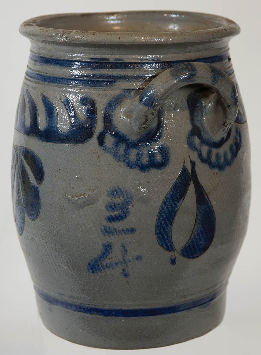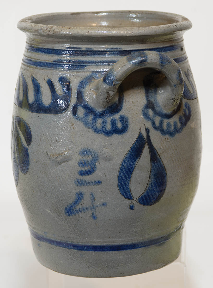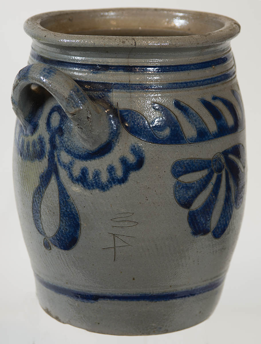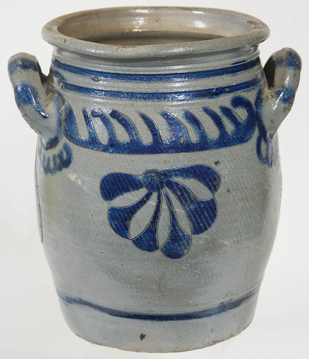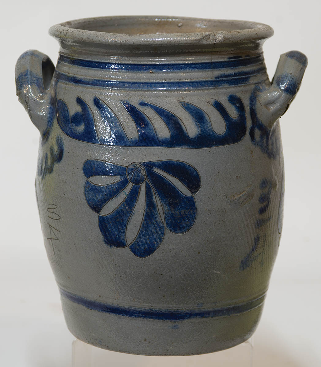 Incised cobalt decorated with waves and flowers, marked “3/4″ under one of the offset handles, double cobalt lines at top and one at bottom, small age lines at rim, 9″ h, 6 1/2” dia (at lid).
