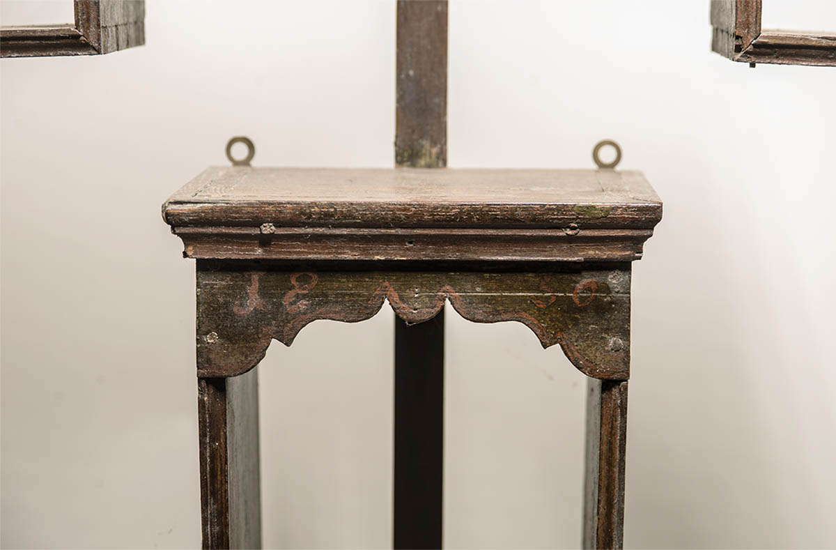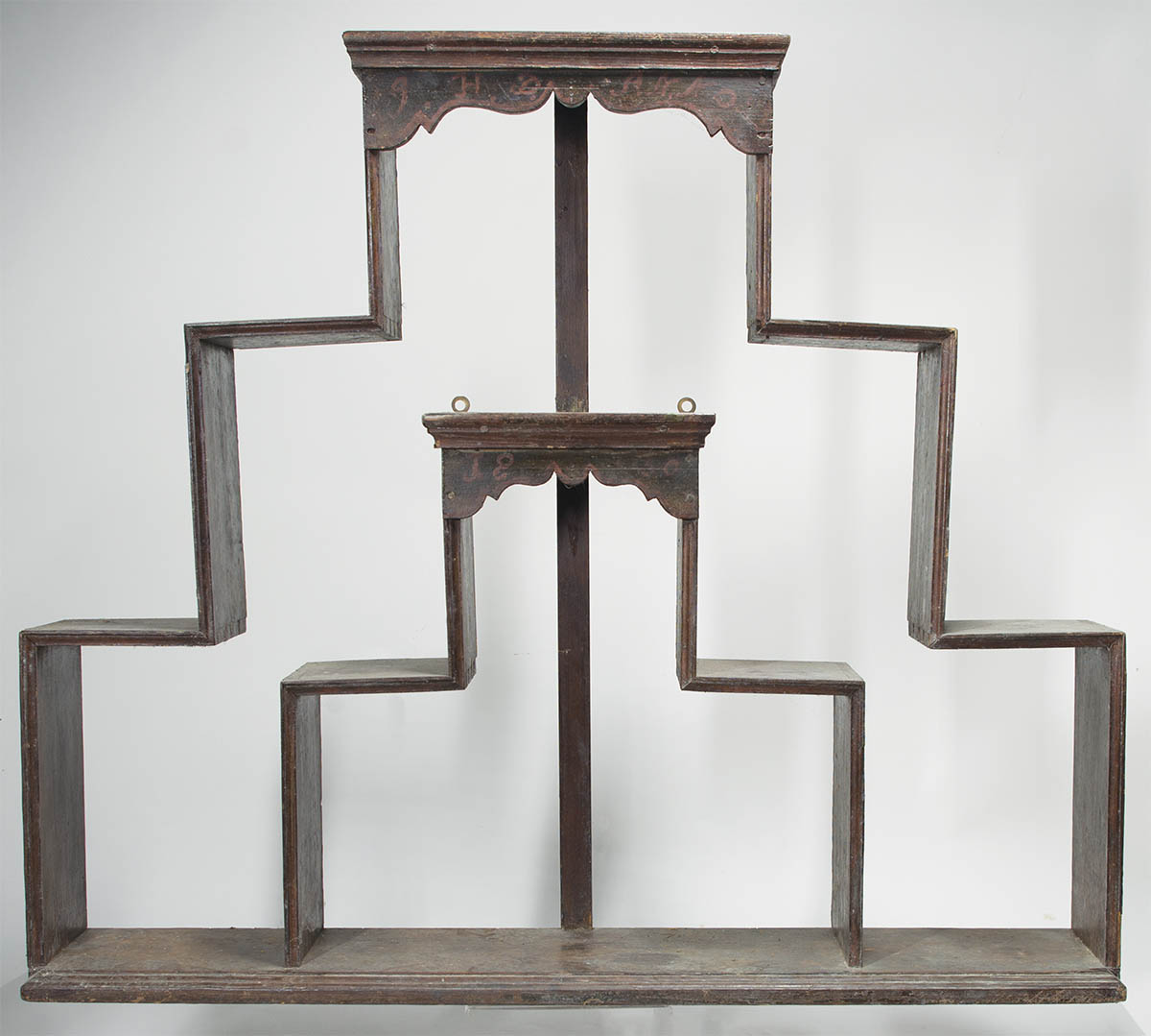 Pine, original painted finish in green and brown, dated “1830” and initialed, dovetailed construction, 24″ h, 27 1/2″ w, 5 1/4″ d.