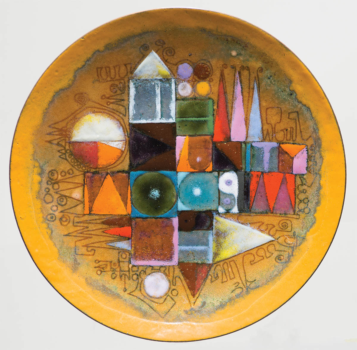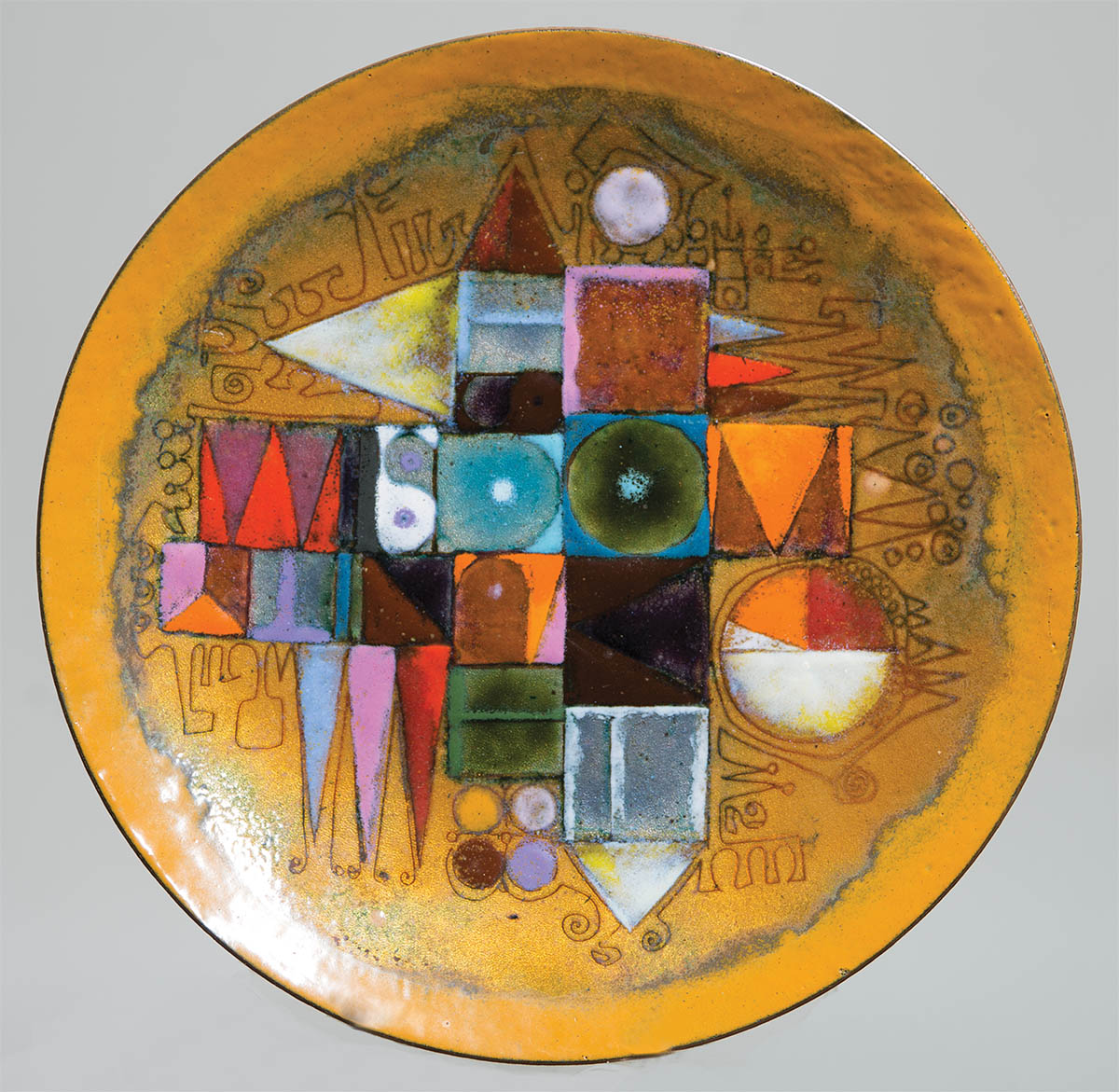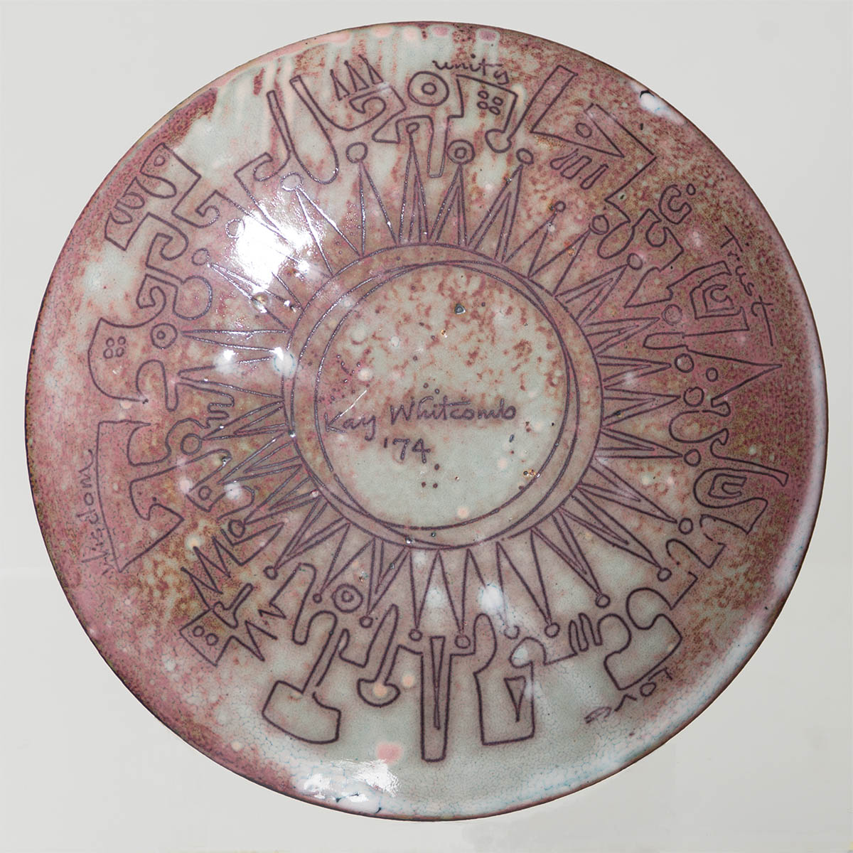 Signed on back “Kay Whitcomb, 1974″, multicolor geometrics on a light copper background, reverse is also in a Whitcomb design, 8” dia.