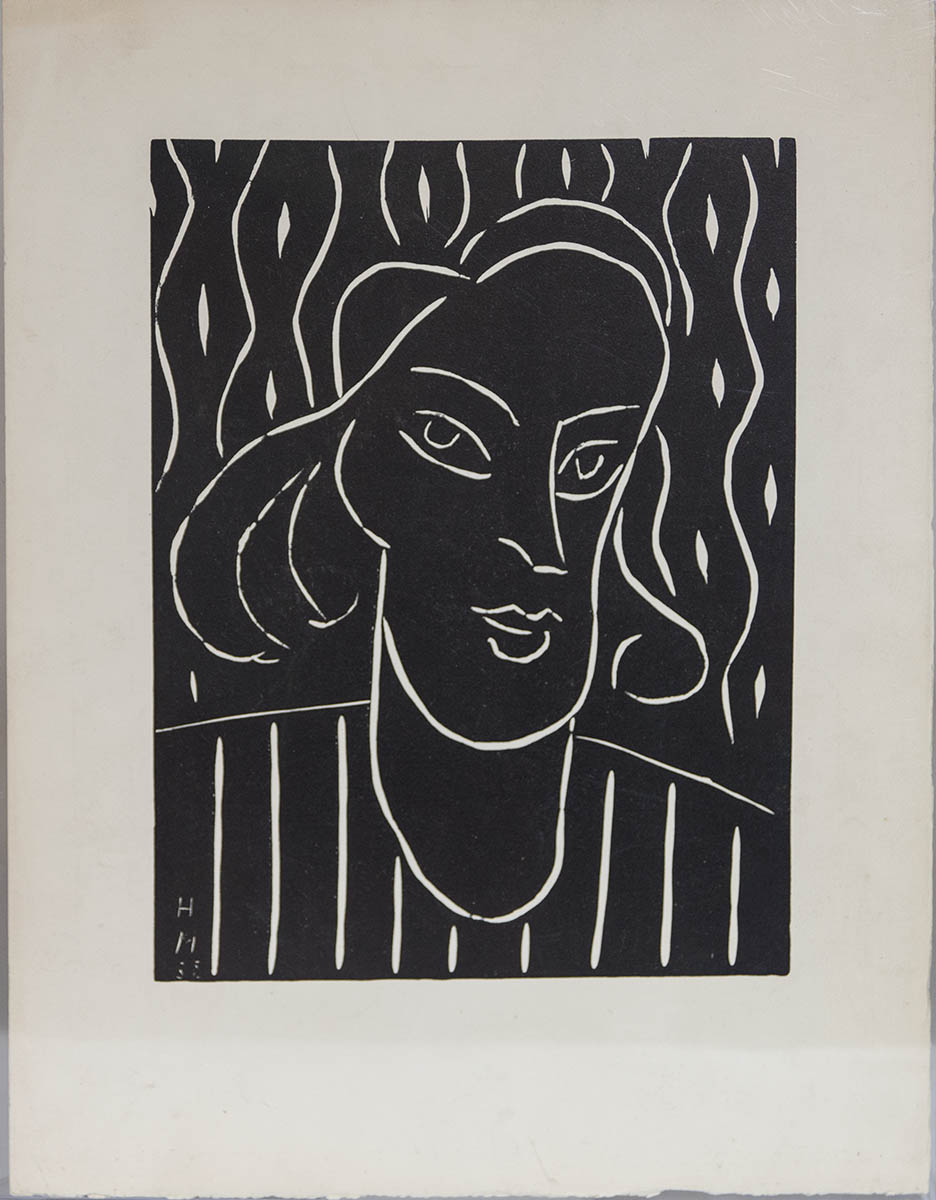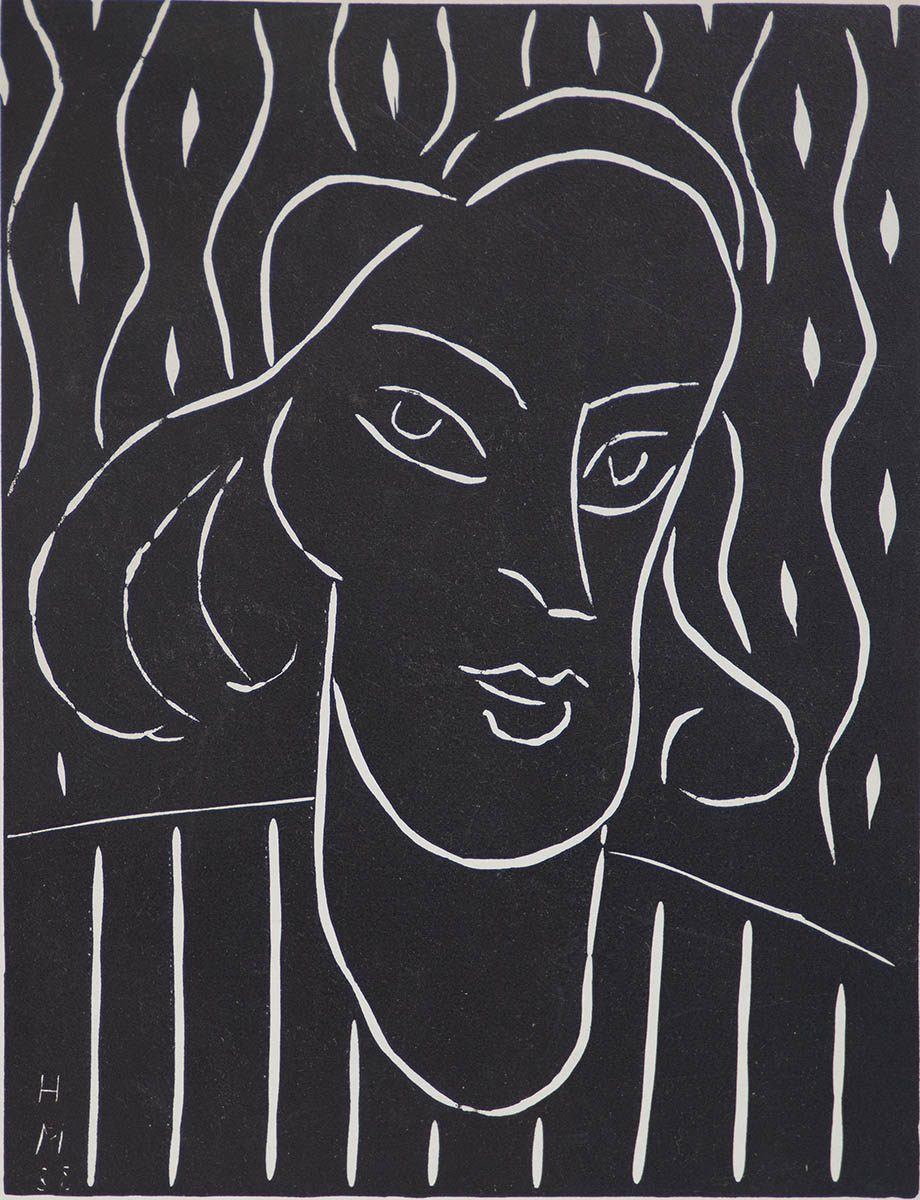 Head of a young lady in black and white, initialed in the print lower left, full borders, 17″ x 13″.
