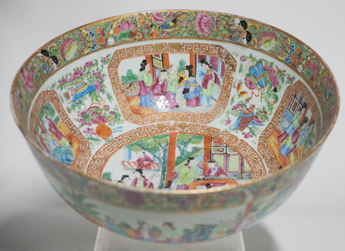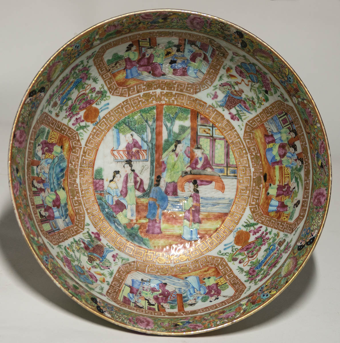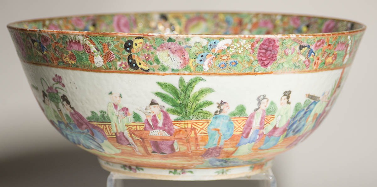 19th c. punch bowl, painted interior and exterior, showing family scenes, excellent condition, Belknap collection, 6″ h, 13″ dia.