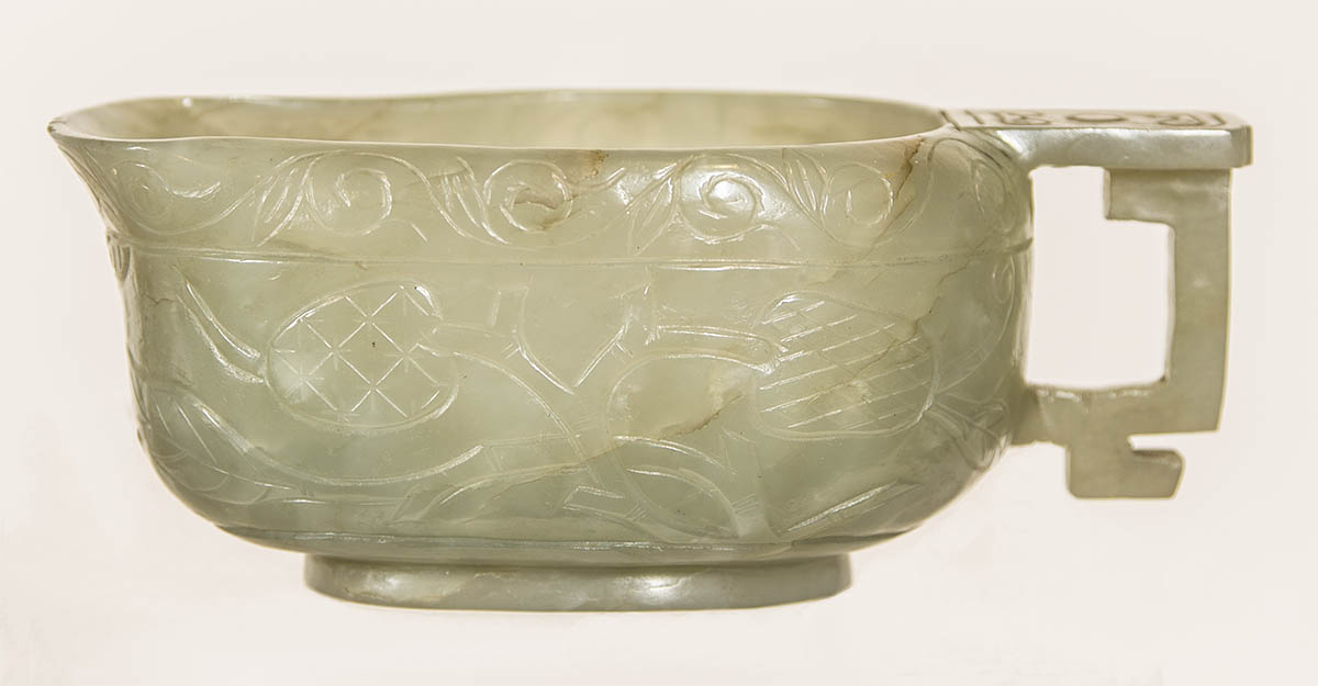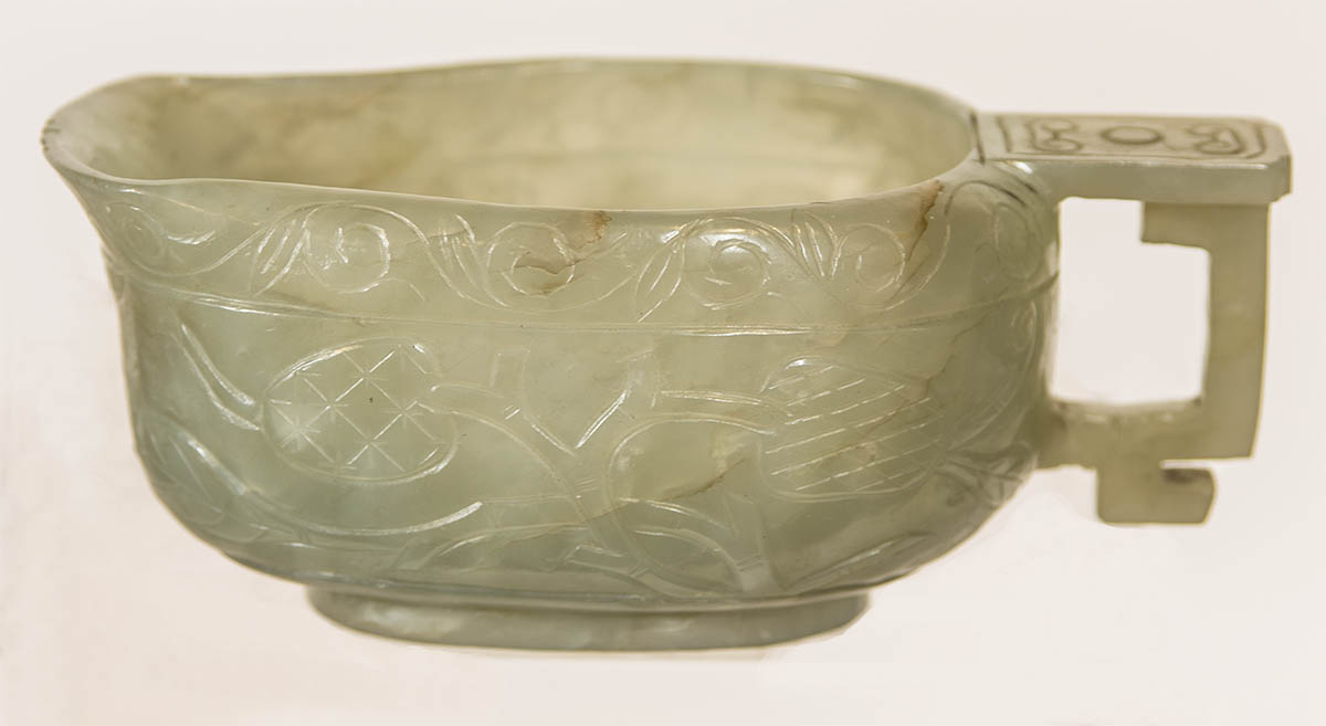 Handled cup, vaseline color, carved with strawberries and vines, footed, small chip on rim, 1 1/2″ h, 4 1/4″ l.