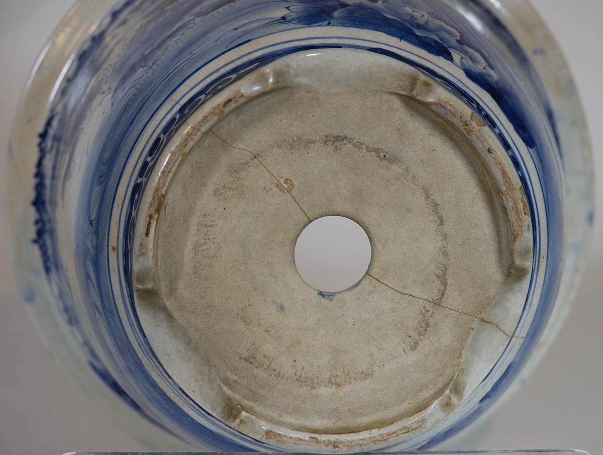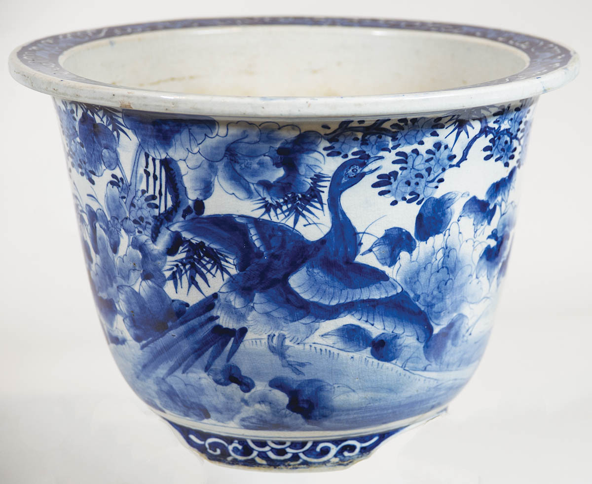 Blue and white ceramic planter, footed, small crack in base, 9 1/2″ h, 13 1/2″ dia.