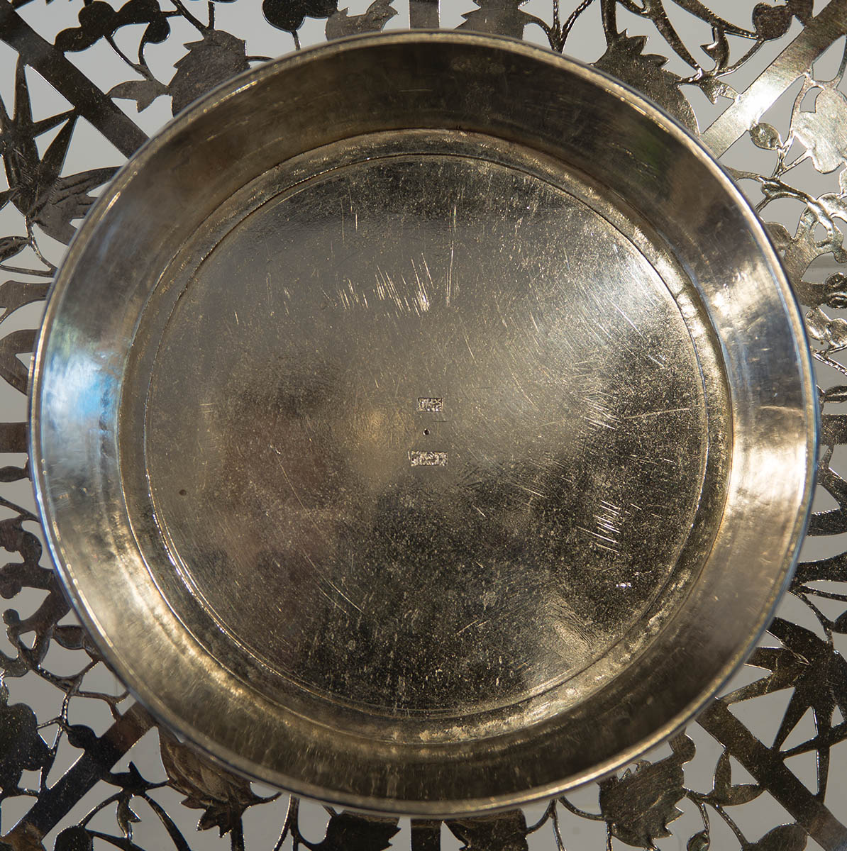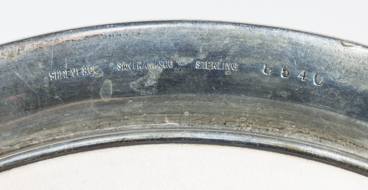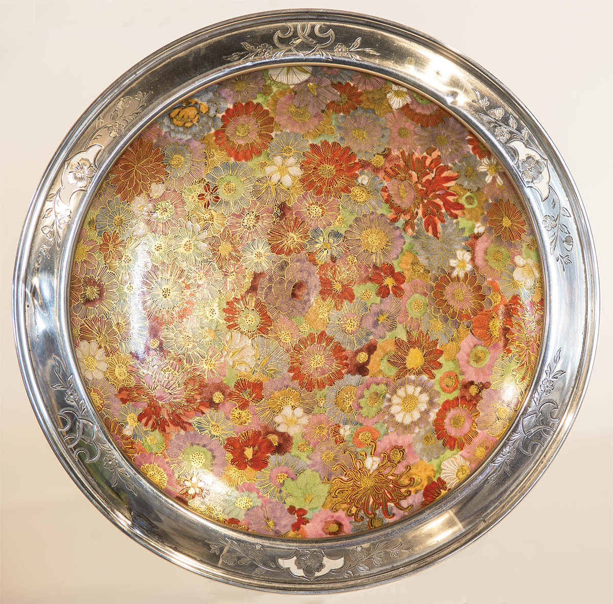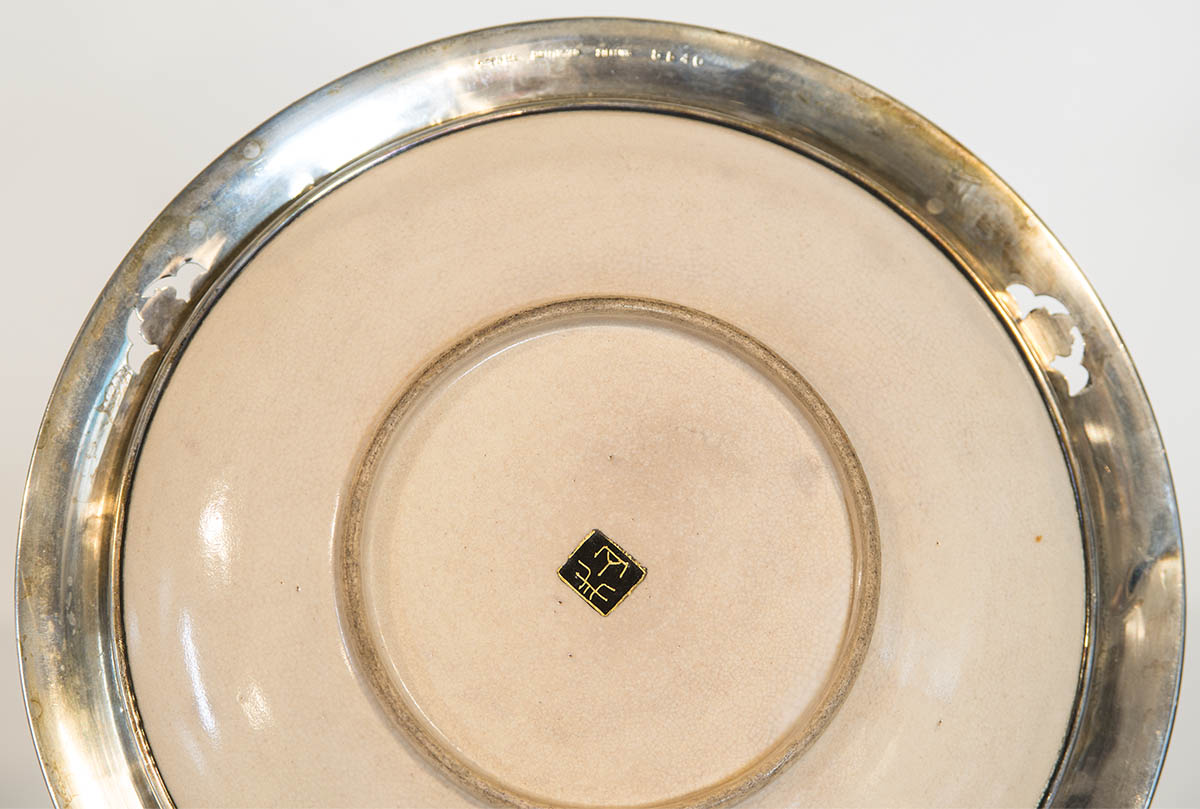 Flared, footed and reticulated silver plate, with flowers and bamboo leaf designs, scalloped edge, hallmark on base, 9 1/2″ dia, 8.8 ozt; Ceramic Asian plate with sterling rim, decorated with floral design, signed “Shreve & Co, San Francisco”, sterling.