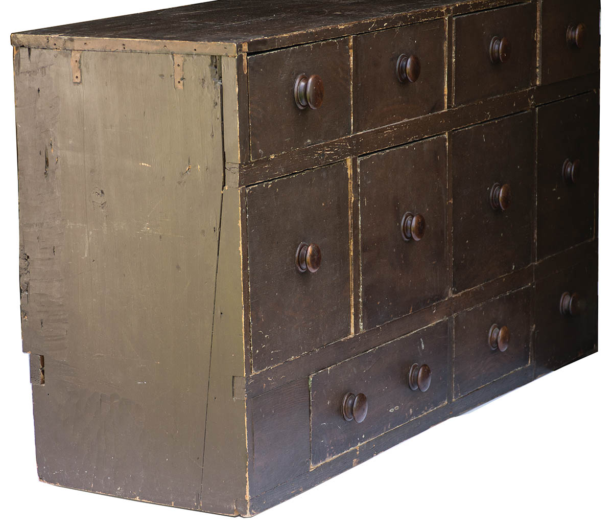 New England, pine, ten drawer apothecary chest, early Spanish brown painted finish, shows some wear to finish on top, 29 3/4″ h, 57 1/2″ l, 16 1/2″ w.