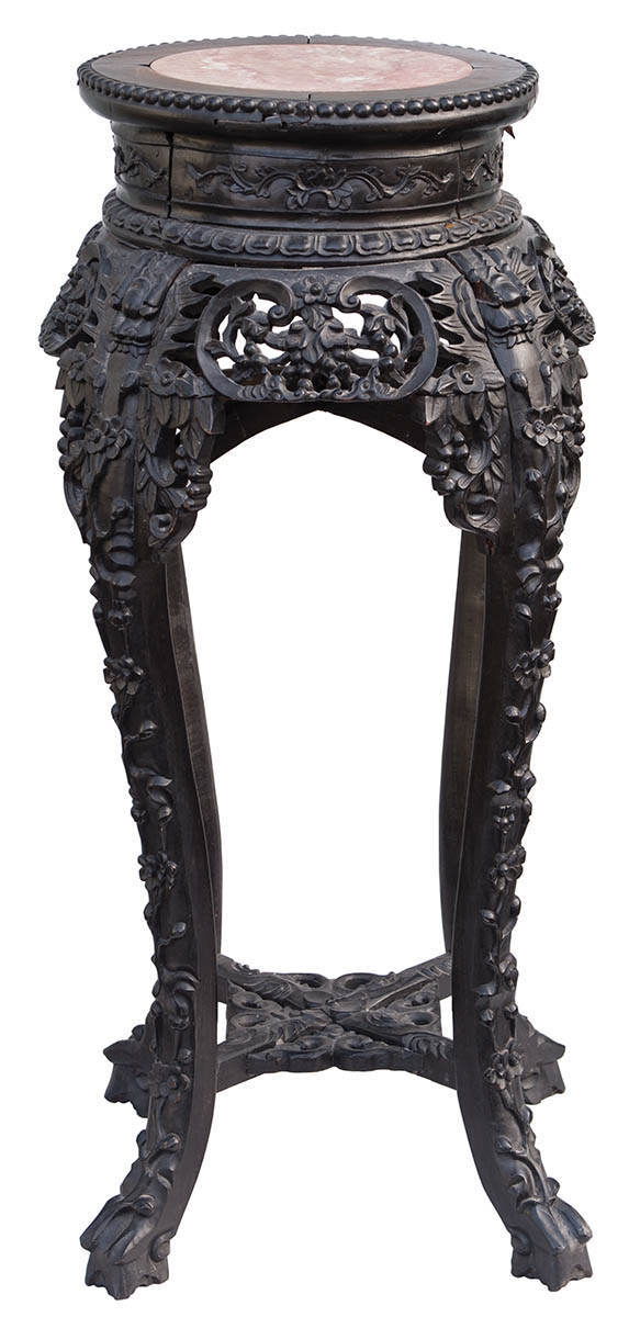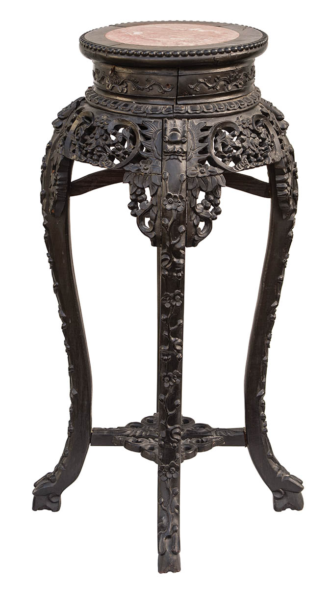 Finely carved with round rose marble insert (8 1/2″ dia), intricately carved with fanged animalistic heads on legs, wooden pegged, skirt with flower and leaf motif, good overall condition, bottom shelf carved, Belknap collection, 34″ h.