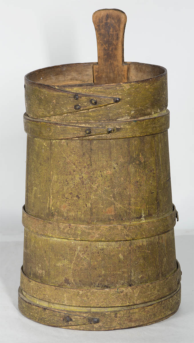 Pine, original yellow painted finish, raised handle, wood laps with rosehead nails, missing dasher and lid, (possibly early Hingham origin), 13″ h, 9″ dia.