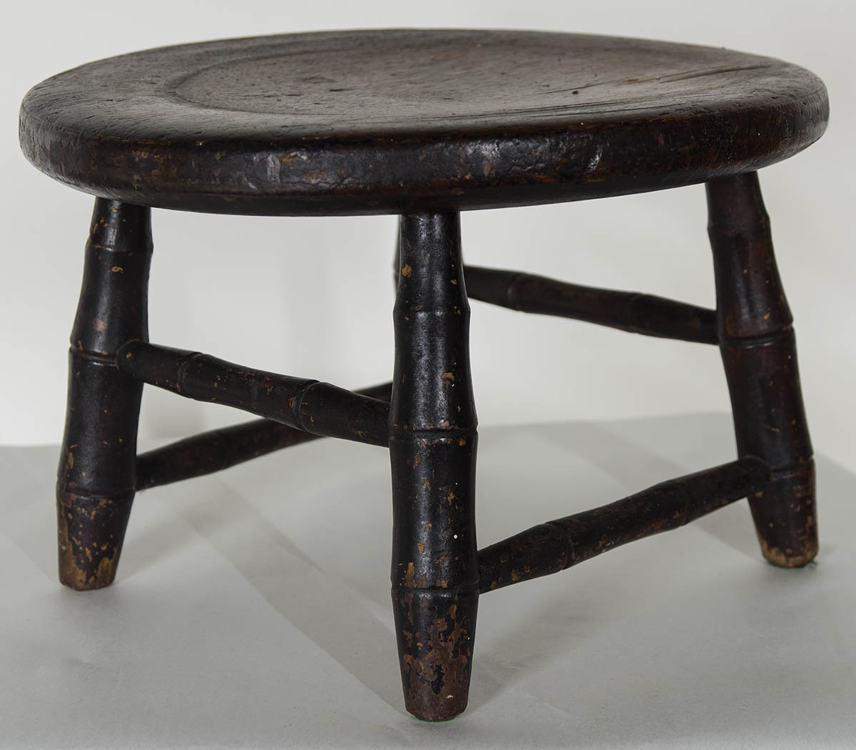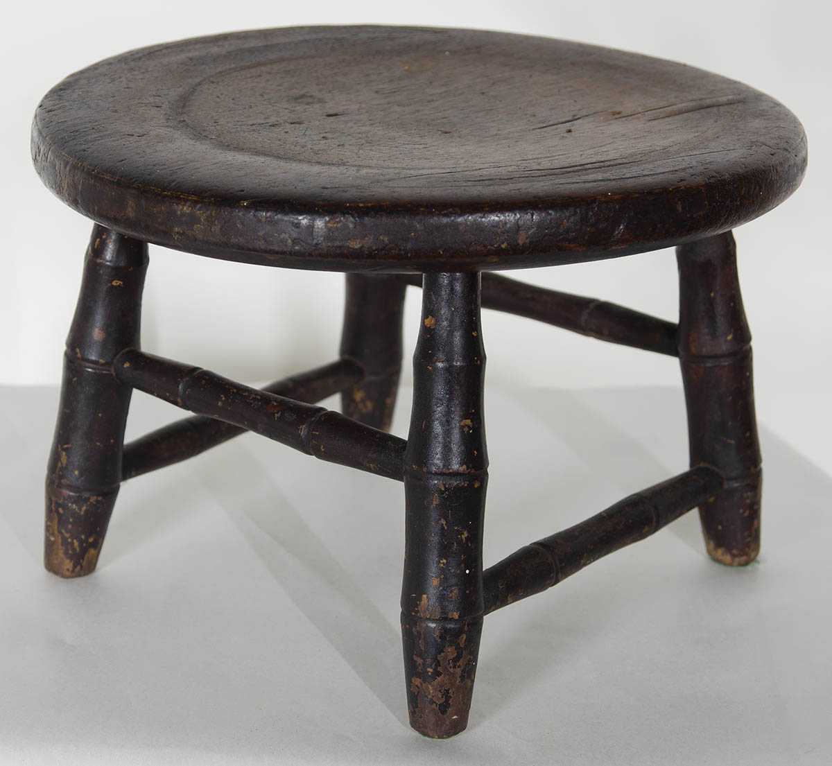 Walnut with original dark Spanish brown stained finish, turned round top, bamboo turned splayed legs with bamboo turned box stretchers, from a Maryland collection, 8″ h, 11 1/2″ dia top.