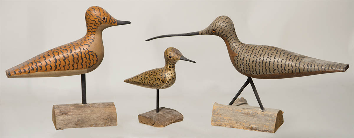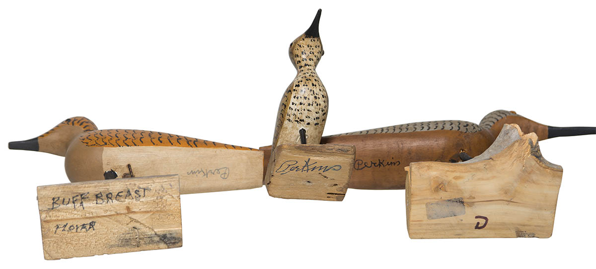 Each on a wood block, glass eyes, all signed “Perkins”, 6 1/2″, 9″ and 15″ l.