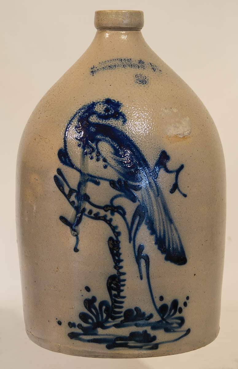 Three-gallon, dark cobalt long-tailed blue pheasant, on a tree stump, stamped “J. Norton & Co., Bennington, VT.”, 15 1/2″ h.
