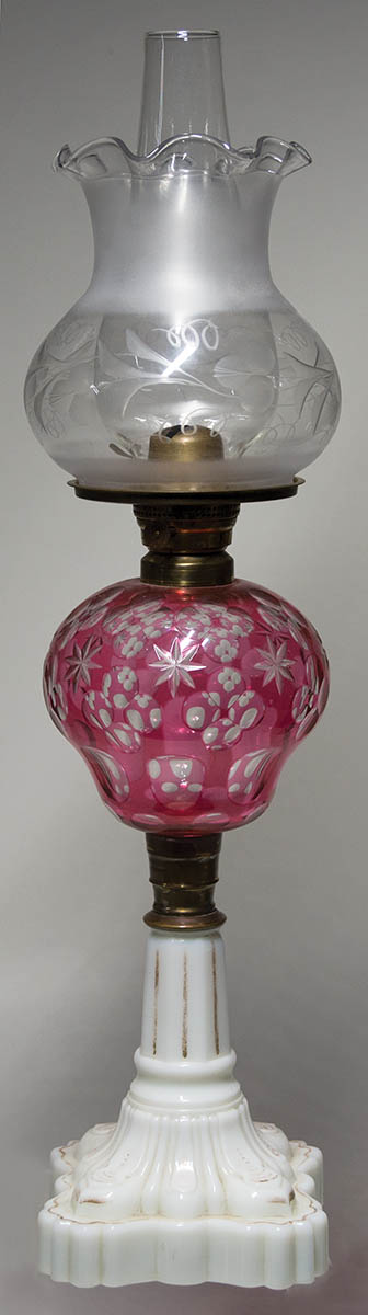 Lamp with glass shade, and red cut to clear bulbous font with brass sleeve, on a milk glass stepped base, Belknap collection, 24″ h.