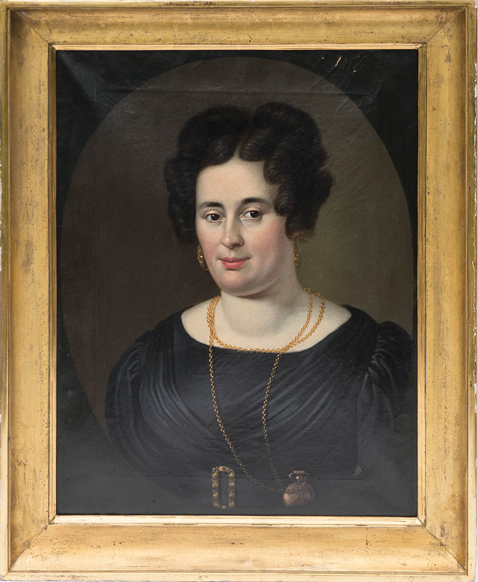 Pair of oil on canvas portraits, of a gentleman and lady with gold chain necklace and watch, gentleman’s portrait shows a small tear lower right, early gilt frames, Belknap collection, 20 1/2″ x 15 3/4″ (sight), 25″ x 20 1/2″ (frame).