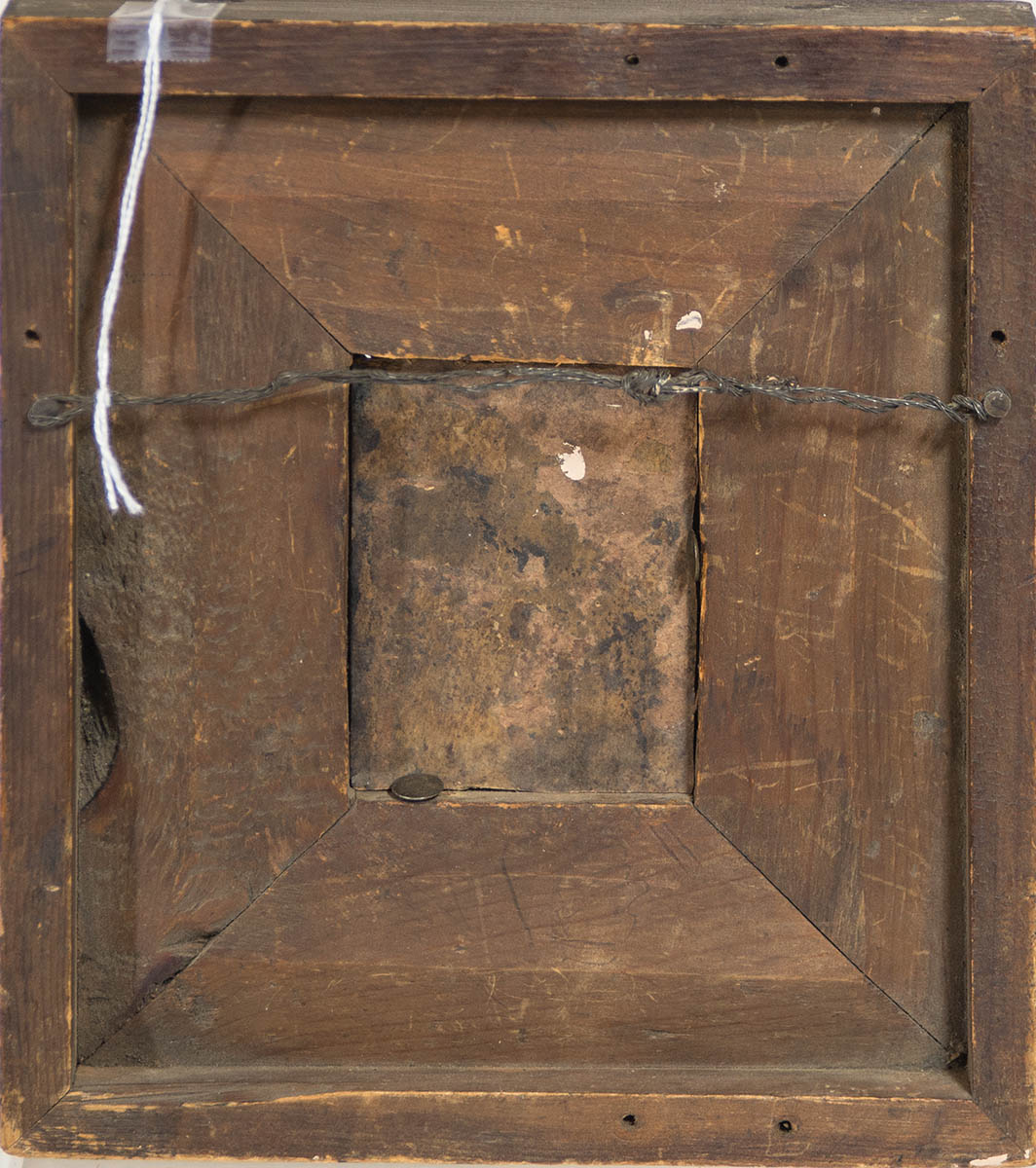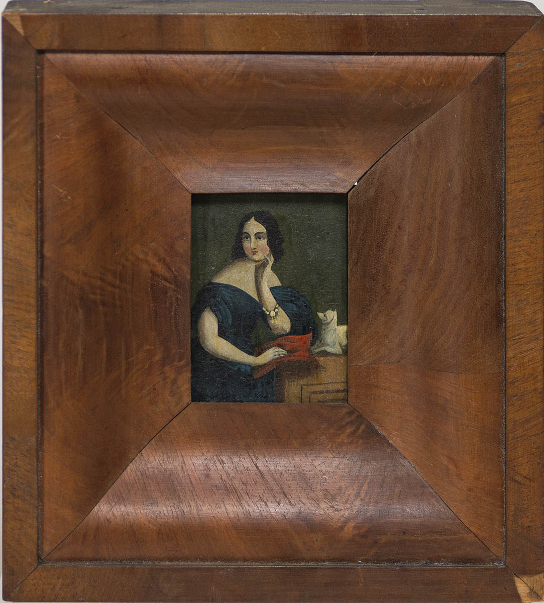 19th c. oil on board miniature, of a young lady in a blue dress, holding a red pillow with her small white lap dog gazing up at her, in a deep set mahogany veneered frame, c. 1840-1850, Belknap collection, 3 1/4″ x 2 1/2″ (sight).