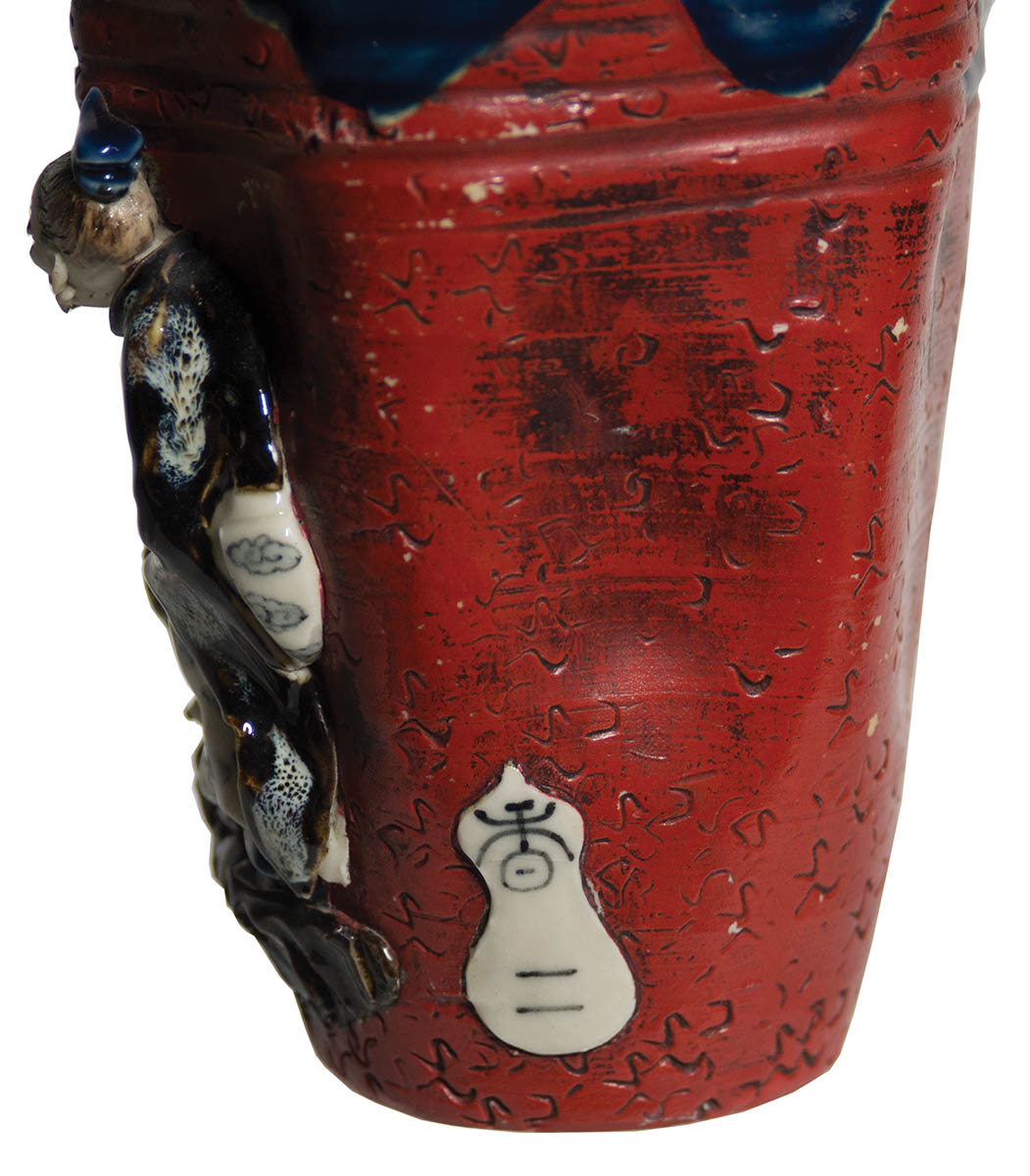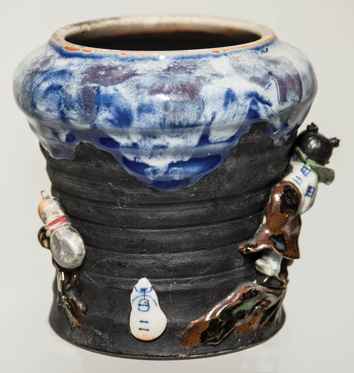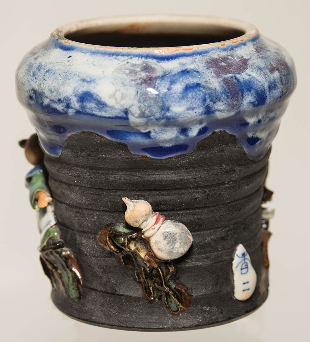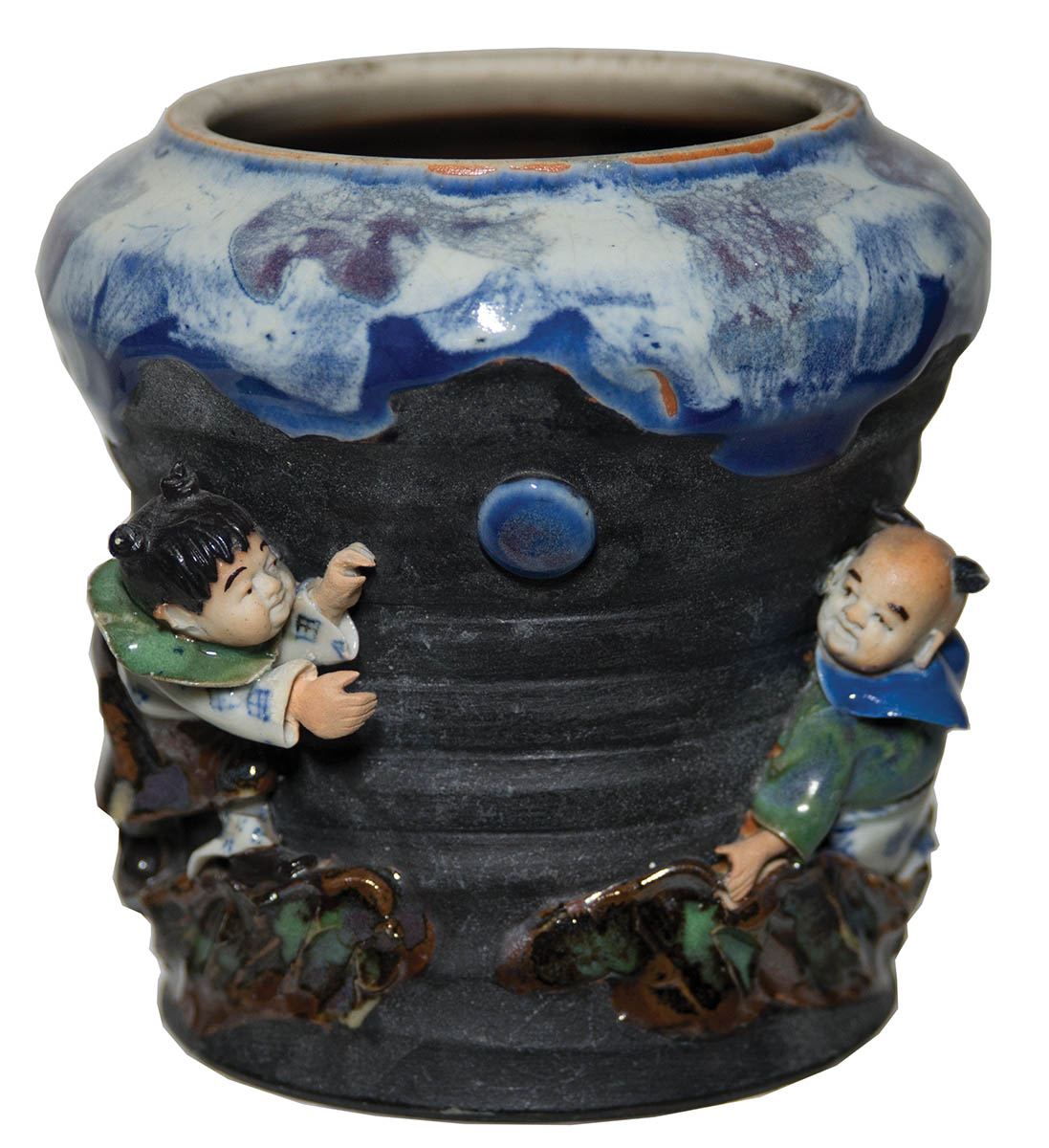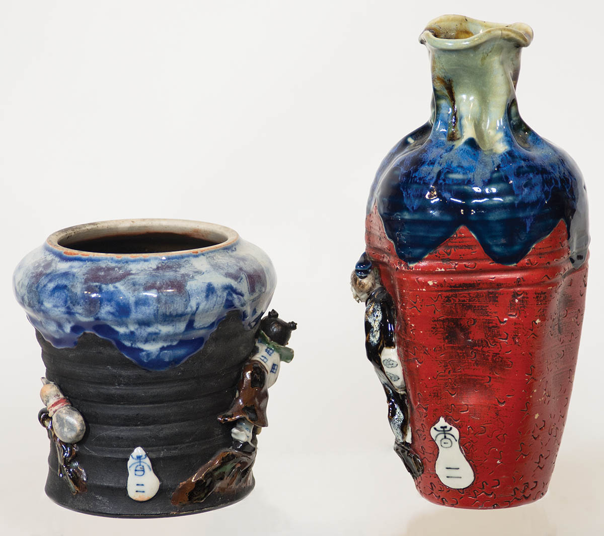 Ceramic finely decorated Shimidagawa vases, one with two applied children playing with a blue ball, 5″ h; and a taller vase, bottle shaped with tall neck flared in petals, blue and red, showing two elders conversing, Belknap collection, 9 1/2″ h.