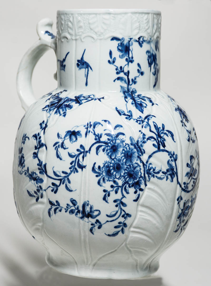 Blue glazed vines, birds and flowers on raised white background, (old age line at handle), raised cabbage leaf band at rim, slight cant towards the handle, Belknap collection, 10 1/2″ h.
