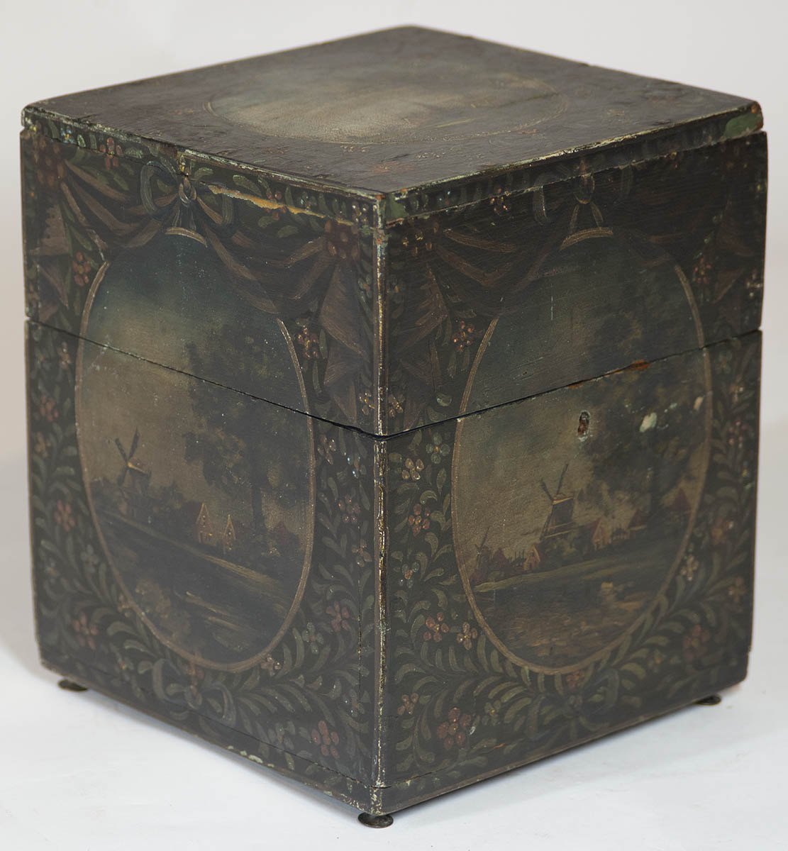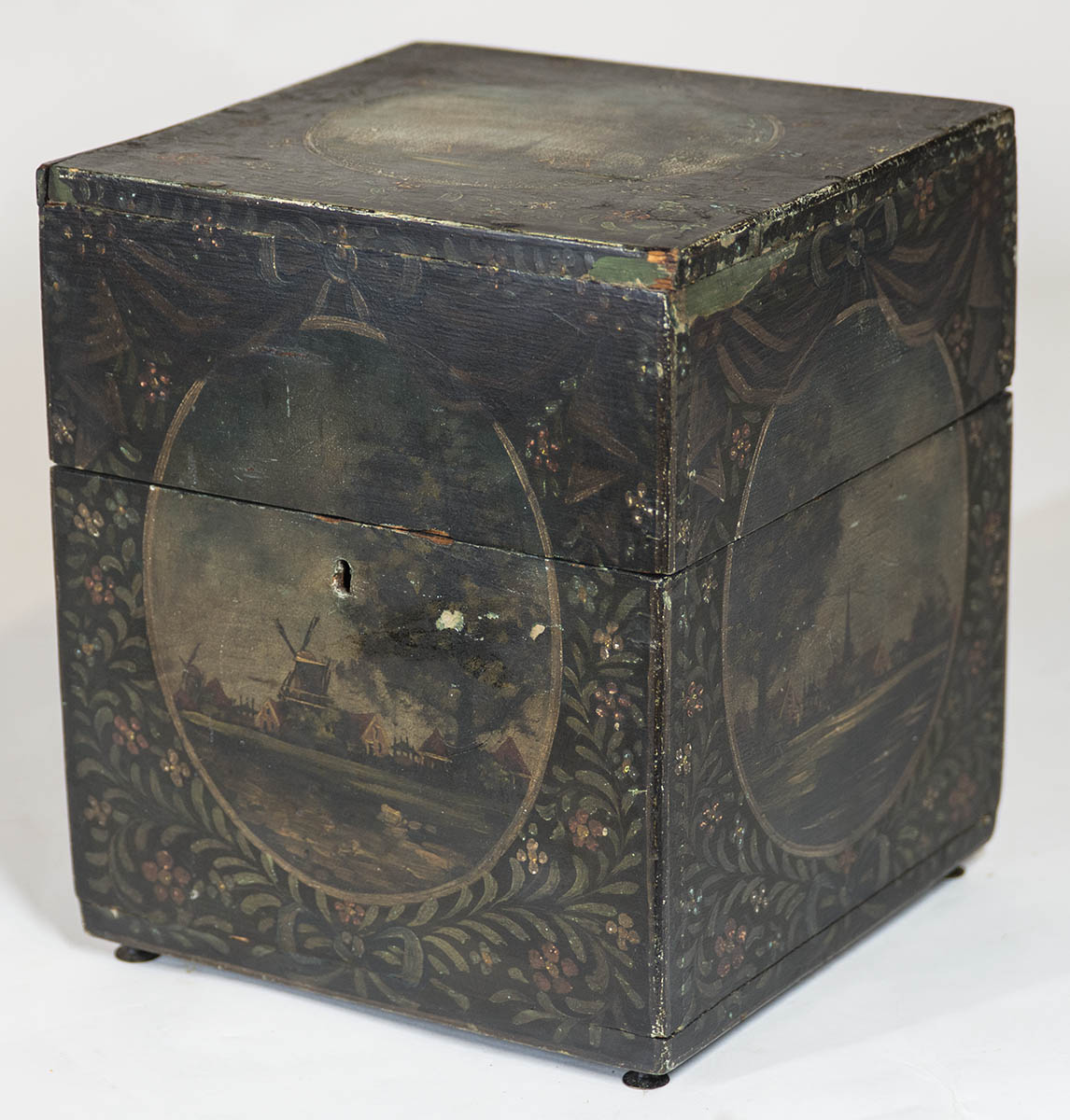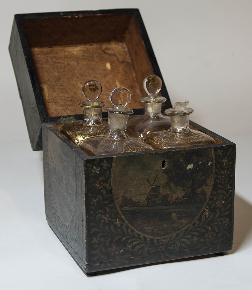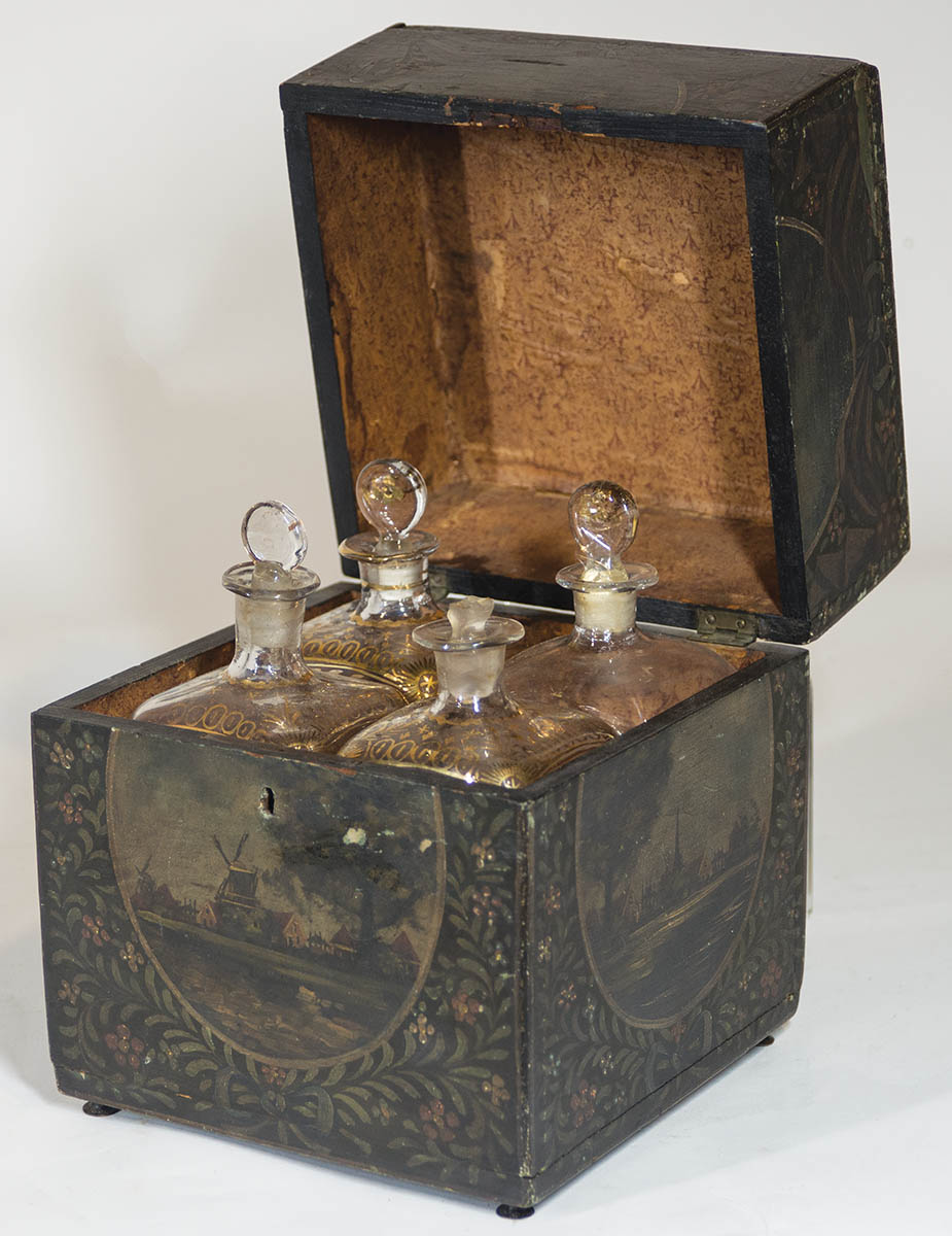 Decorative painted wood, with painted Dutch scenes on four sides of windmills and rural landscapes, surrounded by vines and flowers, paper covered interior, four blown, pontiled bottles with stoppers and gilt decorated tops, (one stopper is chipped and missing, and one bottle is missing decoration), Belknap collection, 8 3/4″ h, 7 3/4″ w, bottles are 7″ h.
