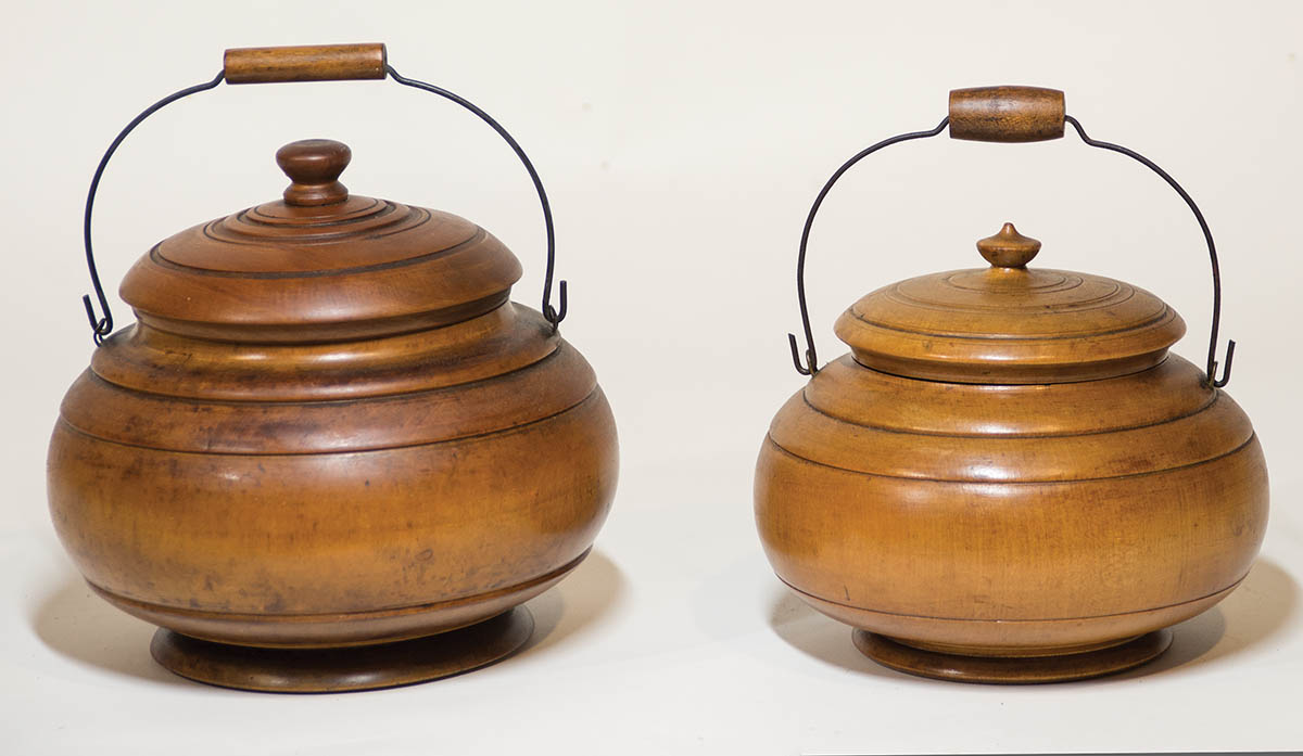 Turned on a lathe, maple, both with wire and wood swing handles, turned and fitted lids, (smaller lid is repaired), both have raised circular foot, 7″ h, 8″ dia, and 8 1/2″ h, 8 3/4″ dia.