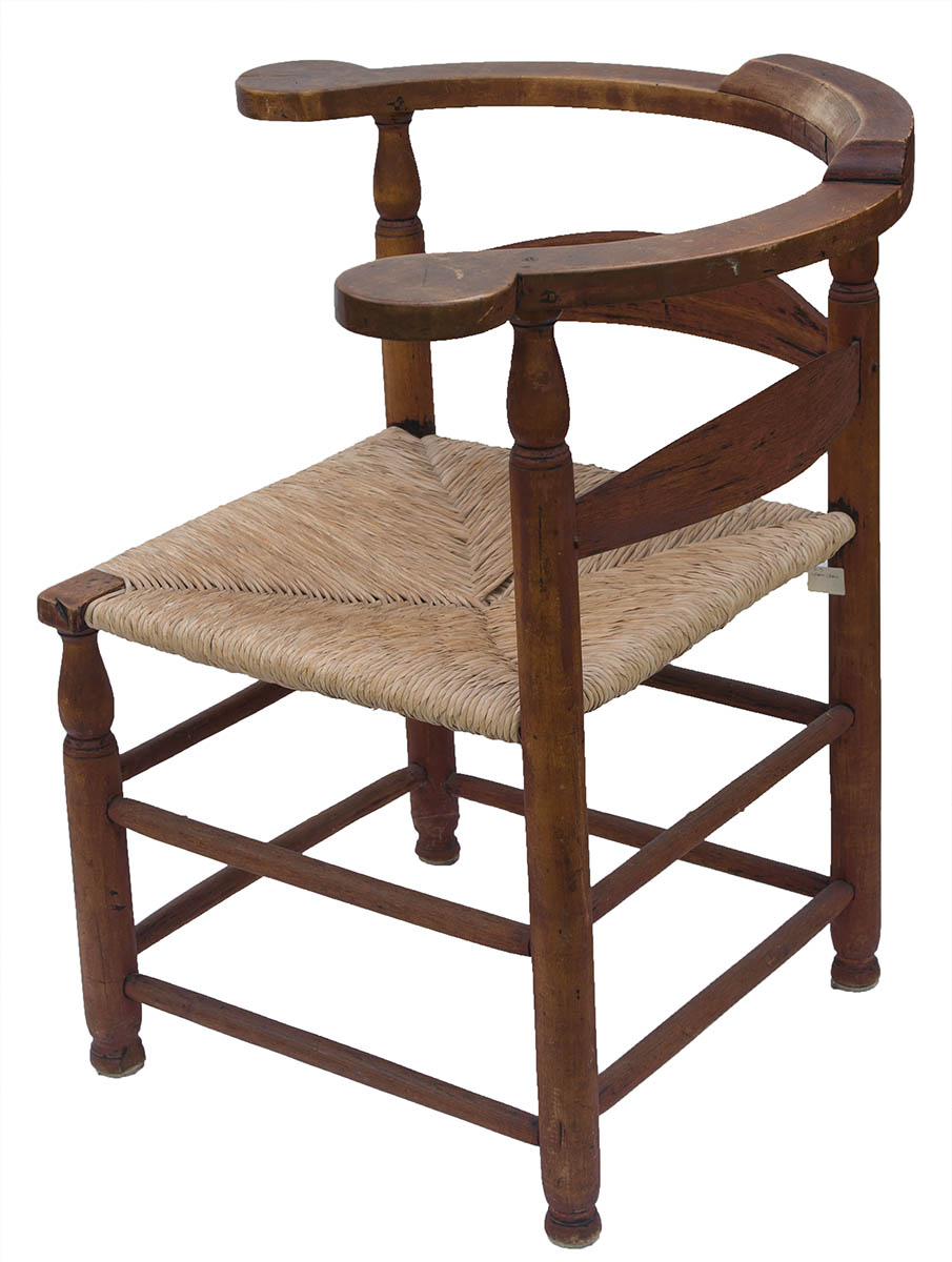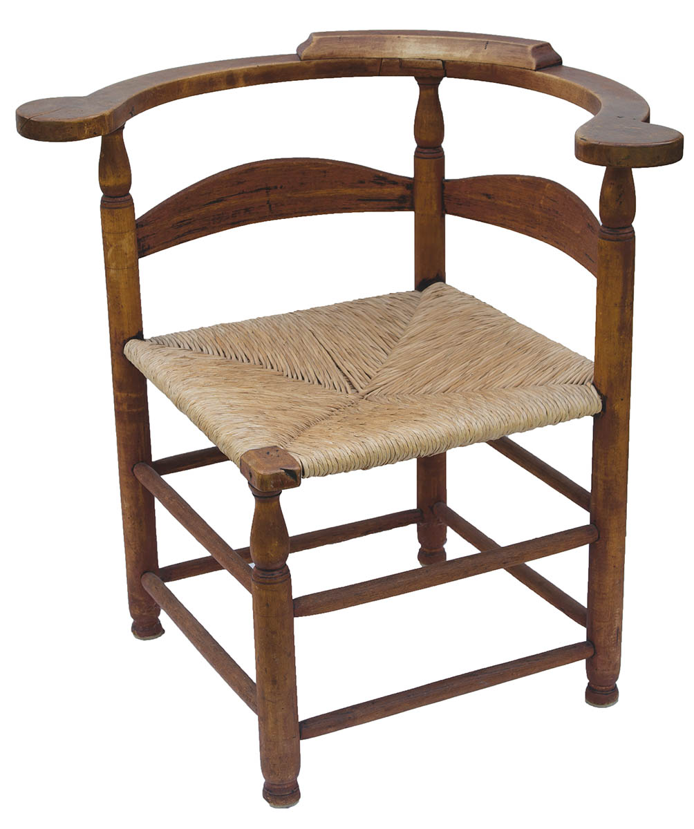 New England, rosehead nails, two slat back, curvilinear tiger maple arms, rush seat, eight stretcher base, ball feet, traces of original black and red painted finish, 16 1/2″ seat h, 29 1/2″ h (to back crest), 22″ seat w, 25″ d.